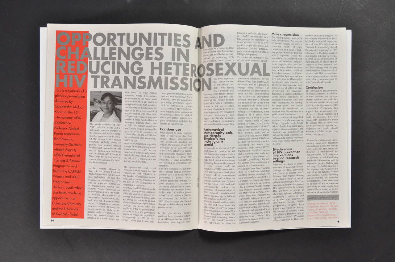 Interview with Laeticia van den Assum 4 // [...] // // The European Union Wakes // up to the challenges of // HIV/AIDS on its new // eastern borders 5 // [...] // // Partnering HIV treatment // with HIV prevention 7 // [...] // // Vaccines Initiatives 8 // [...] // // Clinical Trial Overview 12 // // Opportunities and // challenges in reducing // heterosexual HIV // transmission 14 // [...] // Microbicide research 16 // [...] // The Asian Equation: // One size Doesn't Fit All 17 // [...] // Clinical investigation // of HIV prevention // using chemoproohylaxis 20 // [...] // // Modeling HIV // Epidemics in Asia: // Understanding // the Past, // Altering the Future 22 // // Interview with Karen // Stanecki 23 // [...] // // ANRS activities // on prevention and // treatment 24 // [...] // // HIV(e)Ducation - // training for treatment 25 // [...] // // Column [...] 26 // // Spotlight 28 // [...] (Page 3, en partie inférieure), sur la couvertureTexte
