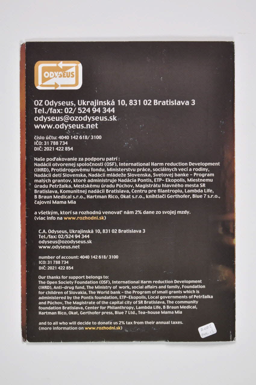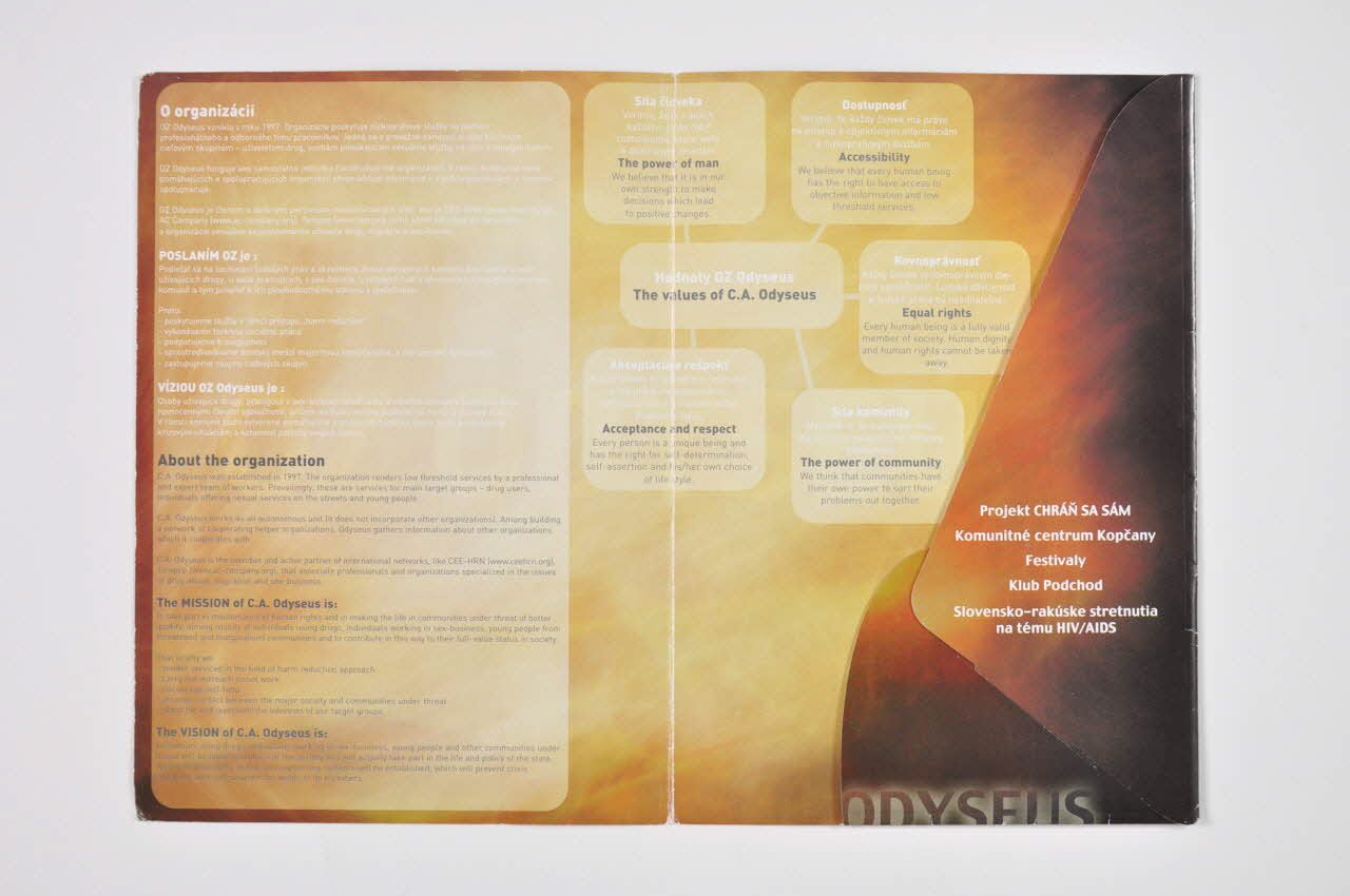 L'intérieur est en camaieu de orange, marron, beige, et porte des encarts plus clairs portant des inscriptions en gris, pour l'anglais et en blanc, pour le slovaque.