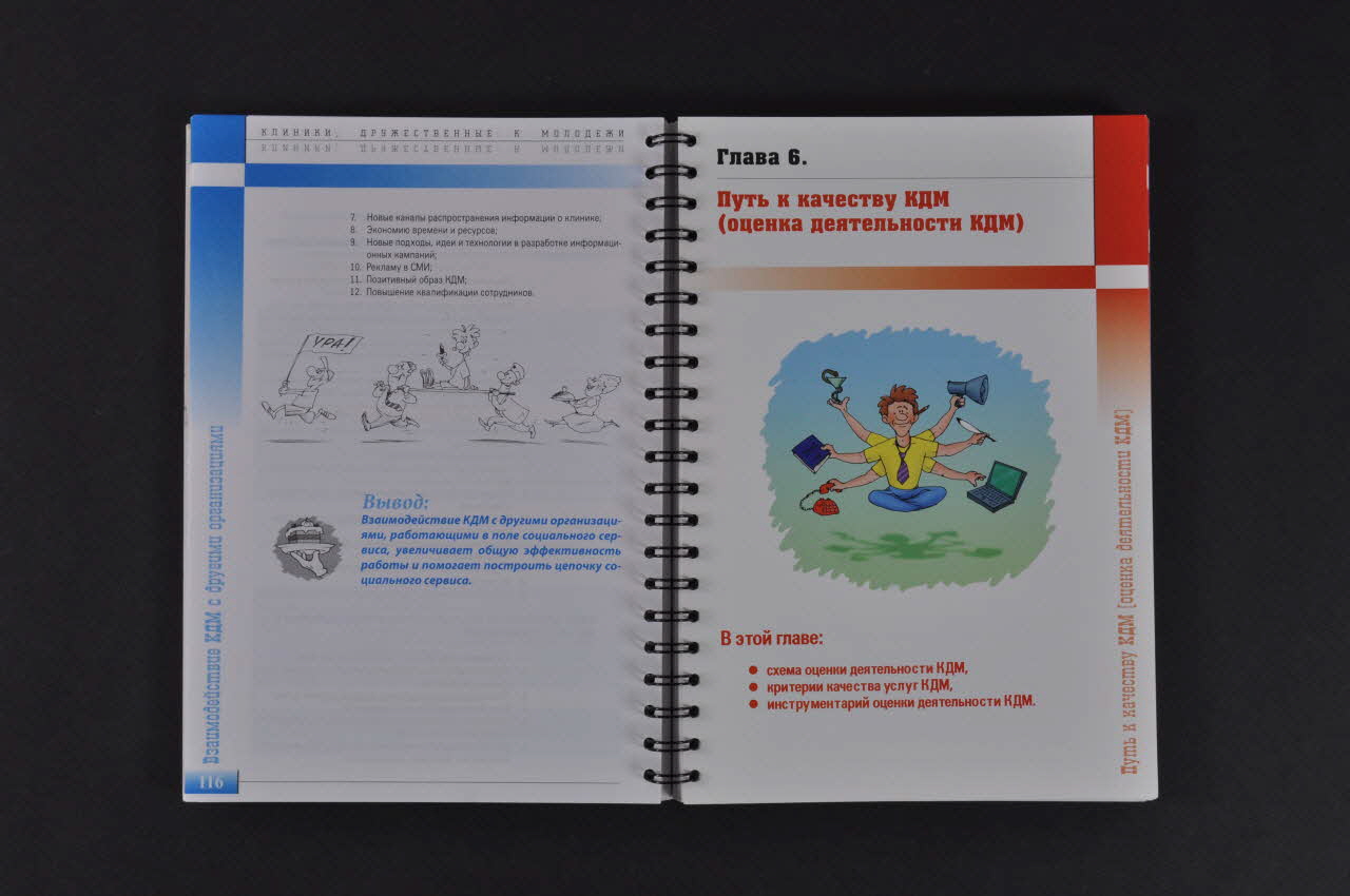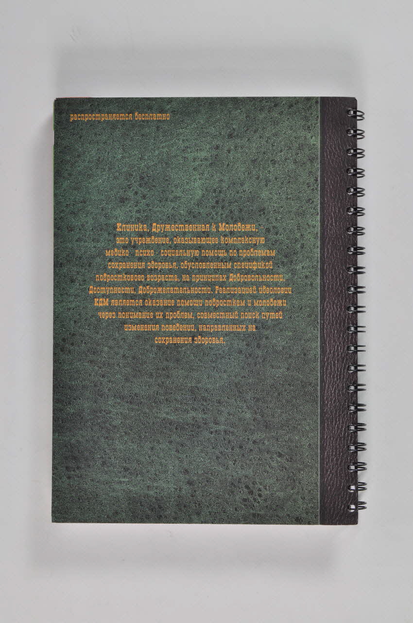 Brochure de format A4, de 276 pages imprimées sur papier blanc et reliées par des spirales métaliques sous une couverture cartonnée. Celle-ci, à fond vert bordé de à gauche, présente, dans un cadre jaune, le titre en capitales cyrilliques oranges. En haut, dans le coin droit, sur fond orange, est dessinée une petite tête humoristique rousse.