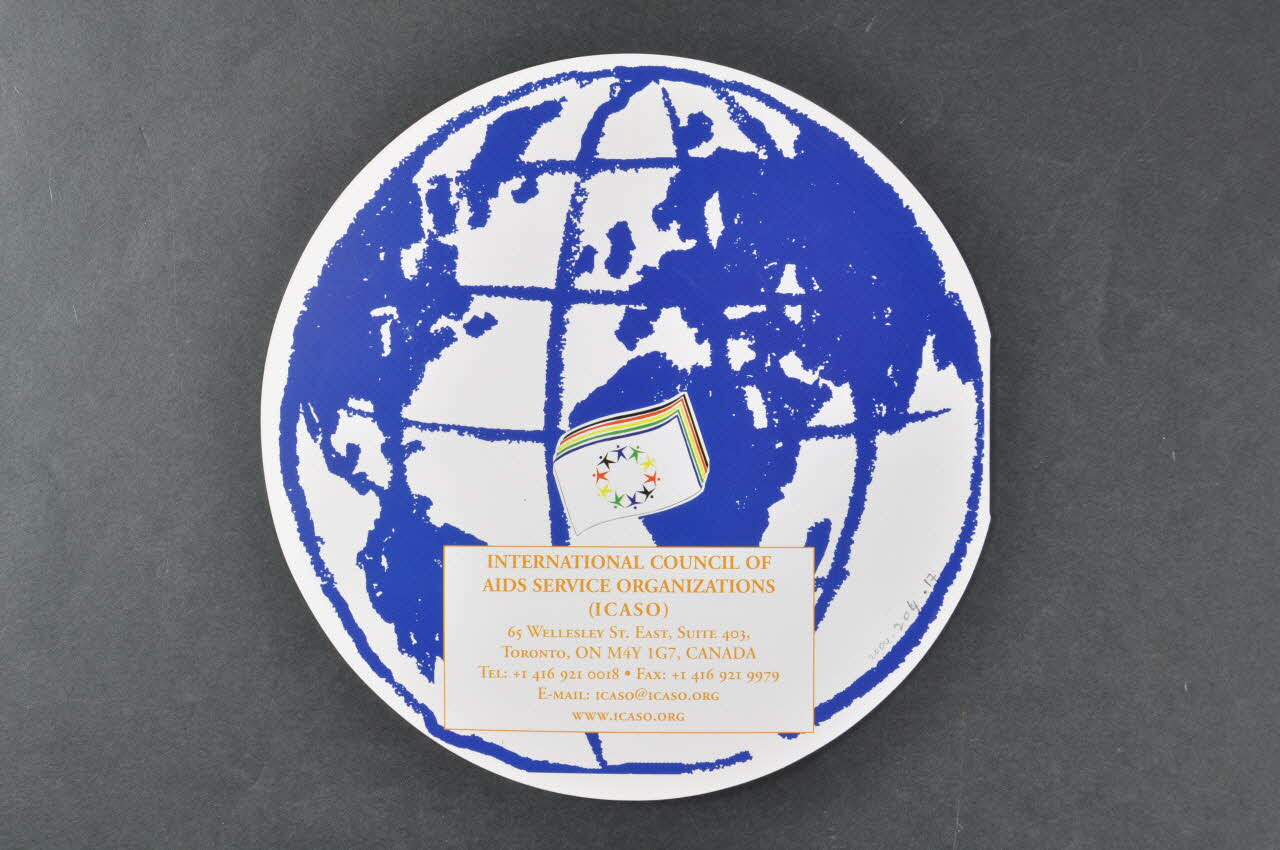 Au dos on trouve la même mappemonde que devant en bleu sur blanc. Un petit drapeau présentant une ronde de personnages jaunes, rouges, bleus, noirs, verts se donnant la main. En bas, dans un encart blanc encadré de jaune, en caractères jaunes, figurent les coordonnées de l'ICASO au Canada.