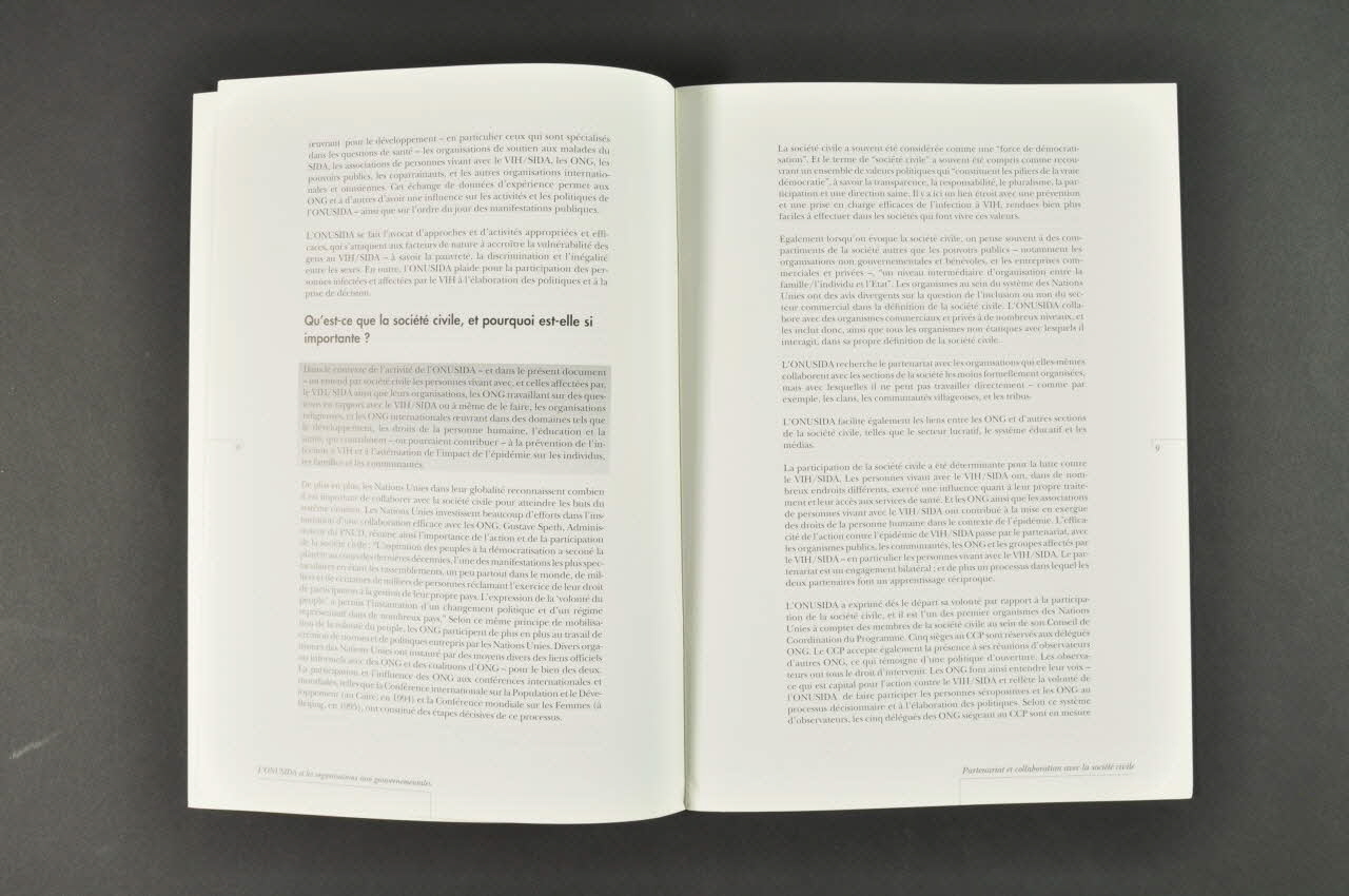 A l'intérieur, le papier présente des textes en noir sur fond blanc avec quelques encadrés en gris.