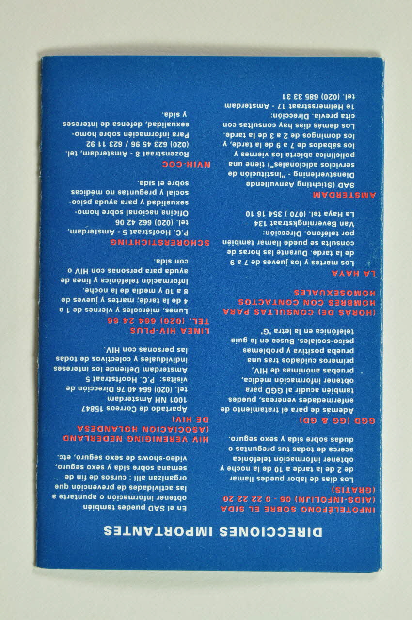 ESP // // SEXO // SEGURO // GAY (En diagonal en blanc, bleu clair et rouge.), rectoTRANSMISION // DEL HIV // // ALTO // RIESGO // // BAJO // RIESGO (Titres de l'intérieur en blanc.), à l'intérieurTexte