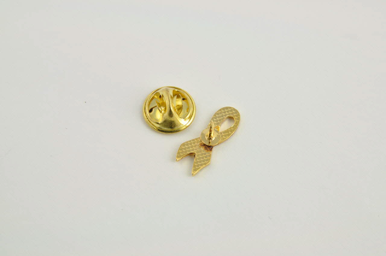 Métal moulé émaillé. / Pin's en métal doré, prenant la forme d'un petit ruban rouge entouré d'un liseré doré, dont le pan gauche présente les couleurs de l'arc-en-ciel.Décor