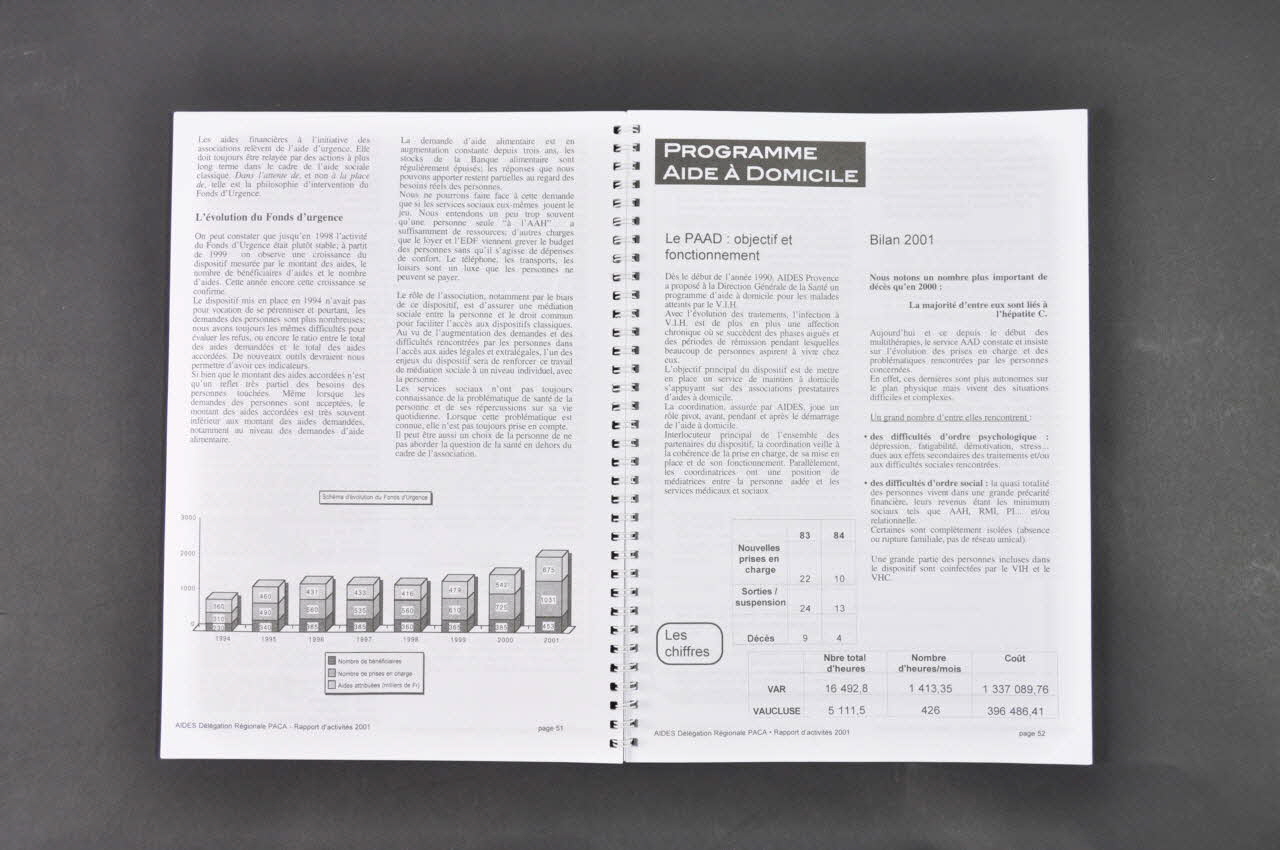 Introduction // - Le mot du Président // - Annuaire des délégations en PACA // - Organigramme salariés // - Communications 2001 // // Les chiffres // // Les actions de soutien // - Accueil // [...] // - Action thérapeuthique // -Alter ego // - APRICARI // - Les mesures ASELL // - AP Fonds d'urgence // - Programme aide à domicile // - Département juridique // // La Réduction des Risques // - Milieu carcéral // - Hommes entre eux // - Usagers de drogues // - Quartiers/Migrants // [...] (Page 2), sur la couvertureAdresse