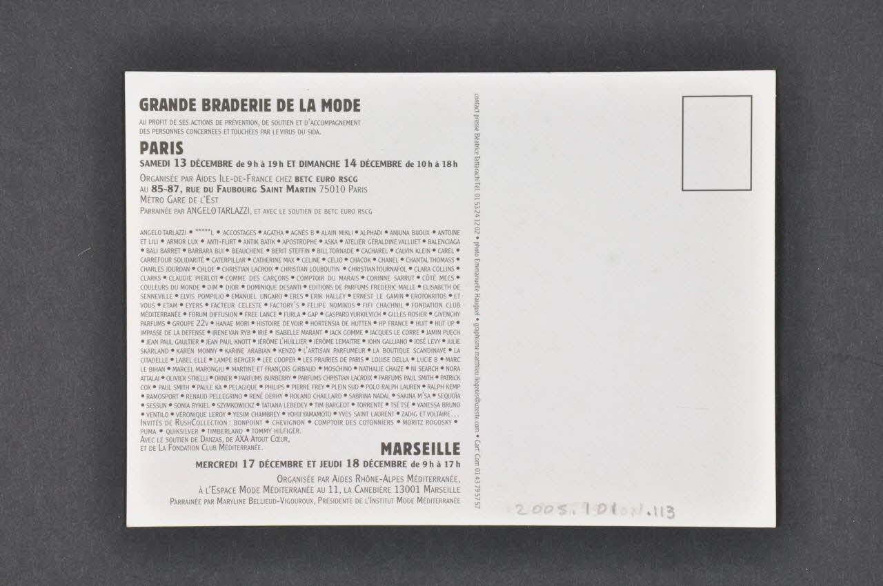 Le recto se lit dans le sens vertical. Il se compose d'un fond noir étoilé de points blancs. Sur la gauche, il y a la photographie couleur d'une femme en robe longue et manteau de fourrure blancs levant les bras et regardant vers le ciel. Dans la partie supérieure, sur un fond noir, en capitales blanches, il y a le nom de l'évènement avec un slogan en capitales "fantaisie" blanches. Le logo de AIDES se trouve juste en dessous. La partie droite du recto est consacrée aux lieux et dates de l'évènement. Dans la partie inférieure droite, les logos des partenaires de l'évènement sont inscrits. Le verso se lit dans le sens horizontal. A droite, un espace est laissé libre pour l'adresse. La partie gauche est entièrement imprimée en noir sur fond blanc. En capitales noires, on retrouve le nom de l'évènement suivi d'un texte donnant ses objectifs. Les lieux et les dates encadrent en haut et en bas la liste des participants à la braderie.Inscriptions