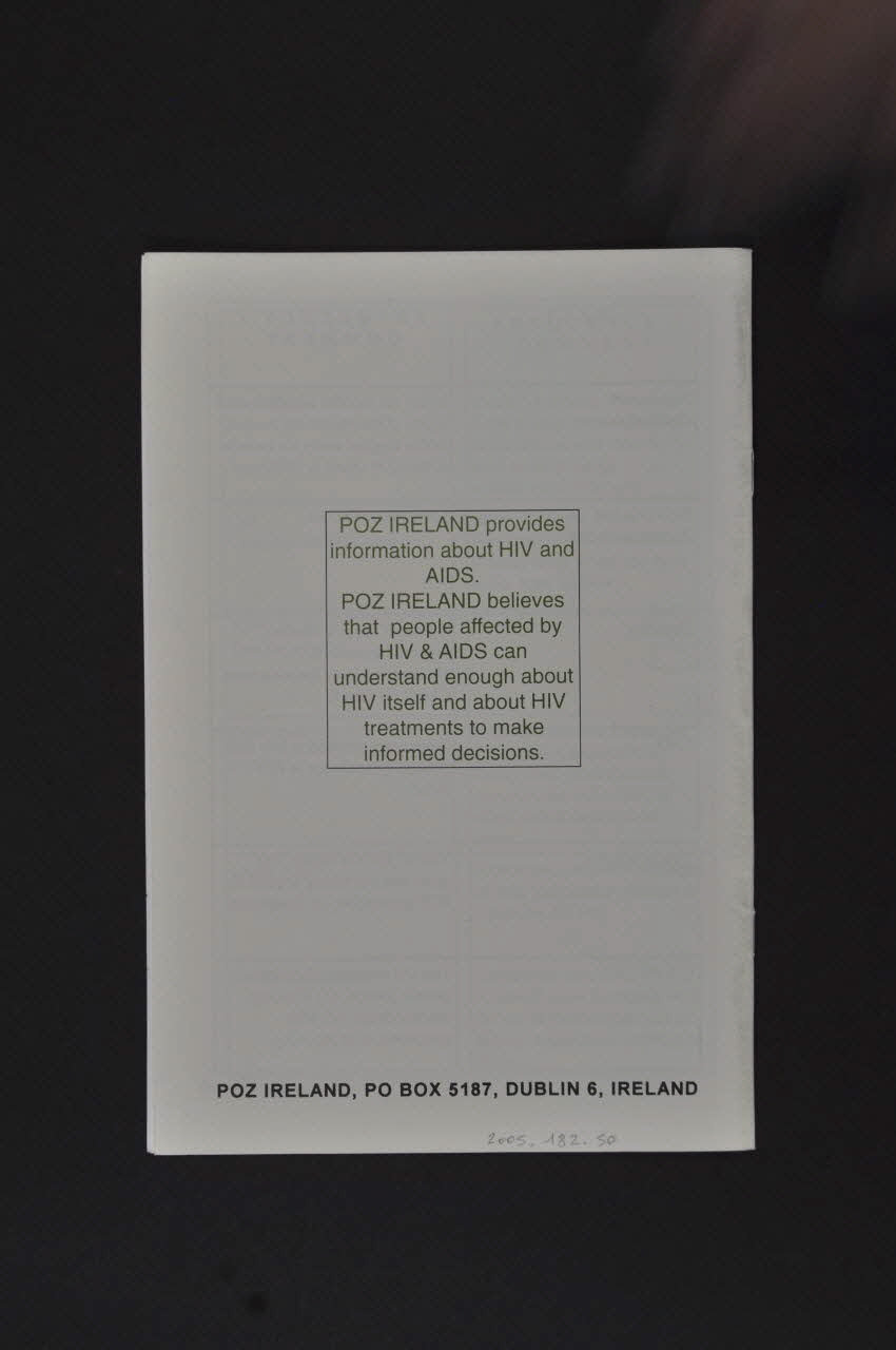POZ IRELAND provides information about HIV and AIDS. // POZ IRELAND believes that people affected by HIV&AIDS can understand enought about HIV itself and about HIV treatments to make informed decisions. (Imprimé en capitales vertes dans un encadré carré au centre), versoSlogan