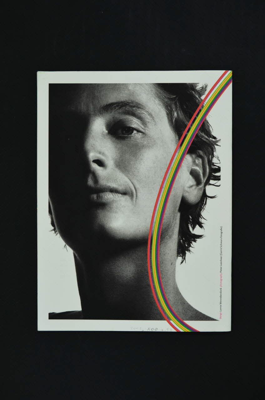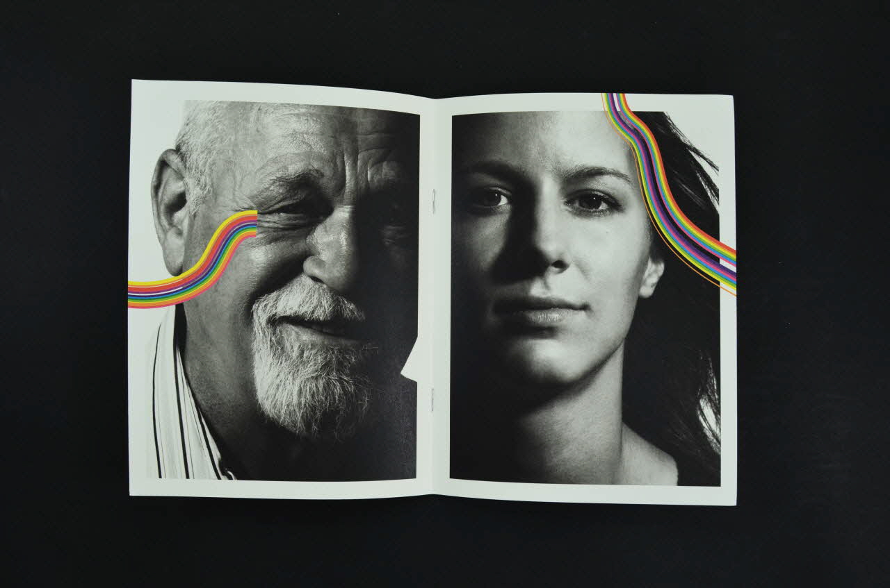 La couverture comporte un fond blanc sur lequel se détache un grand visage masculin vu de profil. Le visage est traversé à gauche par un bandeau composé de traits roses et arc en ciel. Un logo doté d'une inscription noir et d'un rond multicolore se trouve dans le coin inférieur droit. Le dos du dépliant comporte un grand visage féminin en noir et blanc sur fond blanc. Le visage est traversé à droite par un bandeau composé de traits roses et arc en ciel. L'intérieur du dépliant est doté d'un texte en noir avec certains mots colorés sur fond blanc. En haut de chaque page se trouvent des citations en gros caractères multicolores. Les deux pages centrales comportent deux portraits noir et blanc en pleine page : un homme d'un certain âge et une jeune fille.Décor