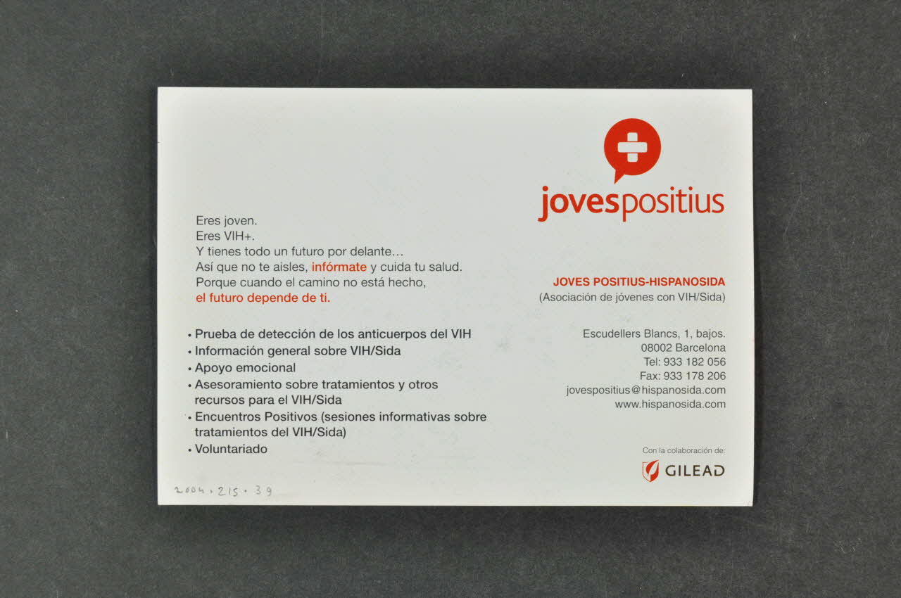 JOVES POSITIUS-HISPANOSIDA // (Associacion de jovenes con VIH/Sida) // Escudellers Blancs, 1, bajos, // 08002 Barcelona // Tel: 933 182 056 // Fax: 933 178 206 // jovespositius@hispanosida.com // www.hispanosida.com (Les coordonnées de l'association se trouvent à droite dans la partie basse du verso. Le nom de l'association est imprimé en rouge et le reste en noir.), versoDécor