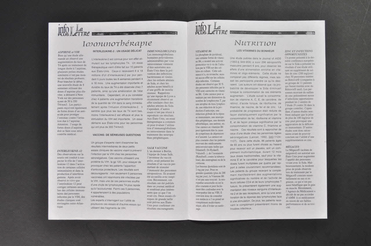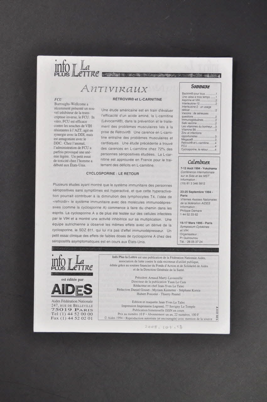 Intérieur : - p.2 Immunothérapie : Aspirine et VIH / Interleukine 12 / Interleukine 2 : un usage délicat / Vaccins : de sérieuses questions / Immunoglobulines - p.3 Nutrition : Vitamine B6 / Les vitamines du bonheur / Zinc et infections opportunistes / Nocivité du Mégace - p.4 Antiviraux : FCU / Tétrovir et L-Carnitine / Cyclosporine : le retour - p.4 Calendrier
