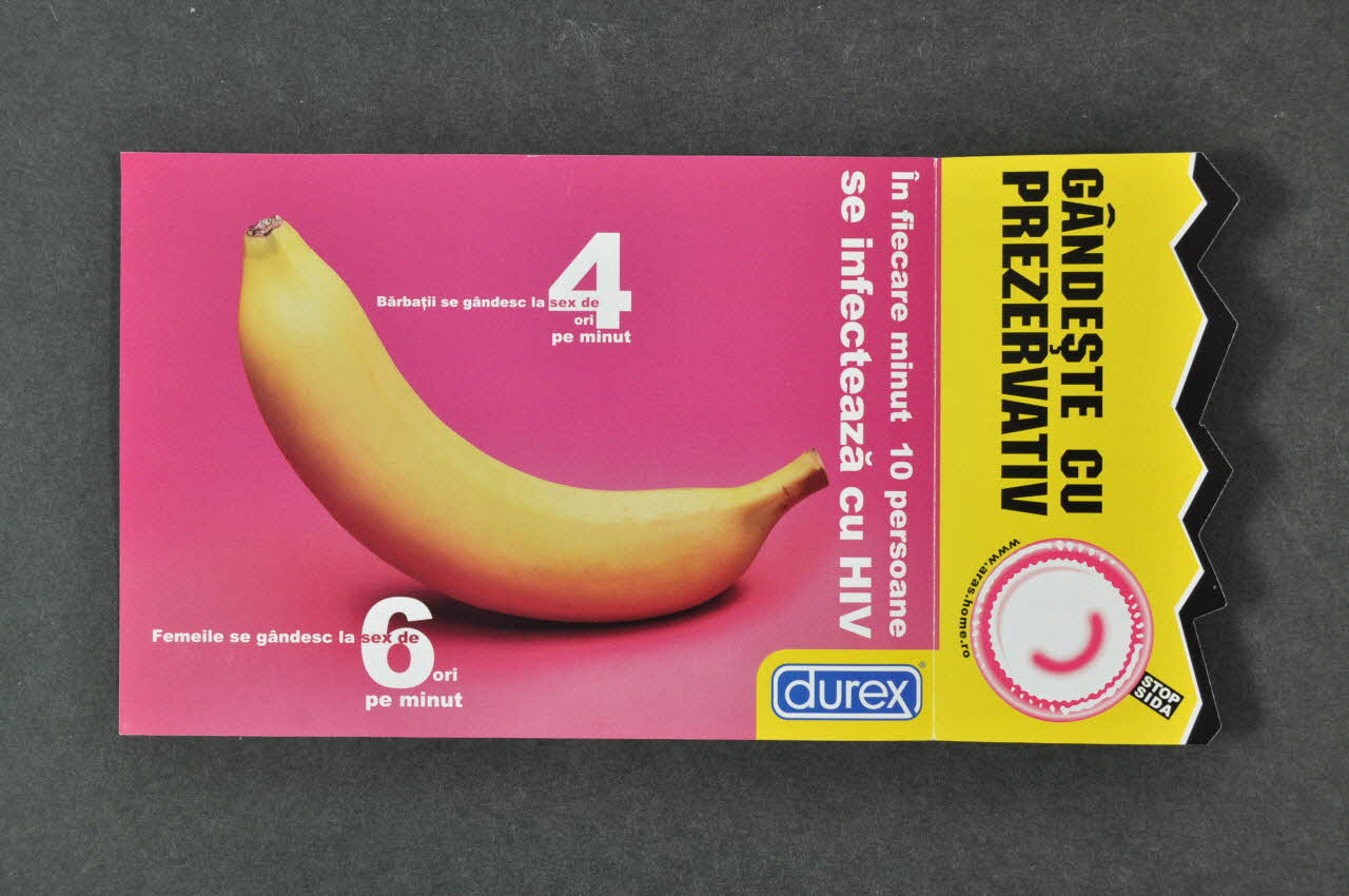 In fiecare minut 10 persoane // se infecteaza cu HIV (à droite, sur le volet principal), rectoStop Sida (à droite, sur le petit volet), versoGÂNDESTE CU // PREZERVATIV (à gauche, sur le petit volet), versoBarbattii se gândesc la sex de 4 ori pe minut (en haut du volet principal), rectoFemeile se gândesc la sex de 6 ori pe minut (en bas du volet principal), rectoLogo
