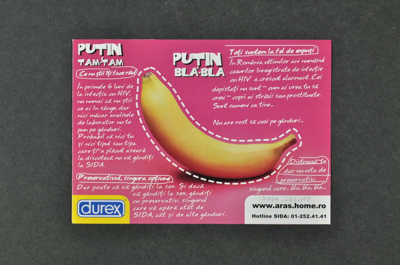 La partie pliée est découpée en zig zag, rehaussé de noir, avec une inscription en blanc au recto et en noir au verso, avec le dessin d'un préservatif. Le dépliant est en couleur, de format rectangulaire et se lit dans le sens horizontal. Il est écrit en roumain. Au recto, sur le fond rose, on trouve la photo d'une banane, accompagné de texte en lettres blanches. Les inscriptions se situent au dessus, en dessous et à droite (à la vertical) de la banane. En bas à droite, se trouve un slogan. Au verso, sur un fond rose, une banane est entourée de nombreux texte en blanc, du type écriture manuscrite. En bas à gauche se trouve un logo et à droite une adresse et un numéro de téléphone.Inscriptions