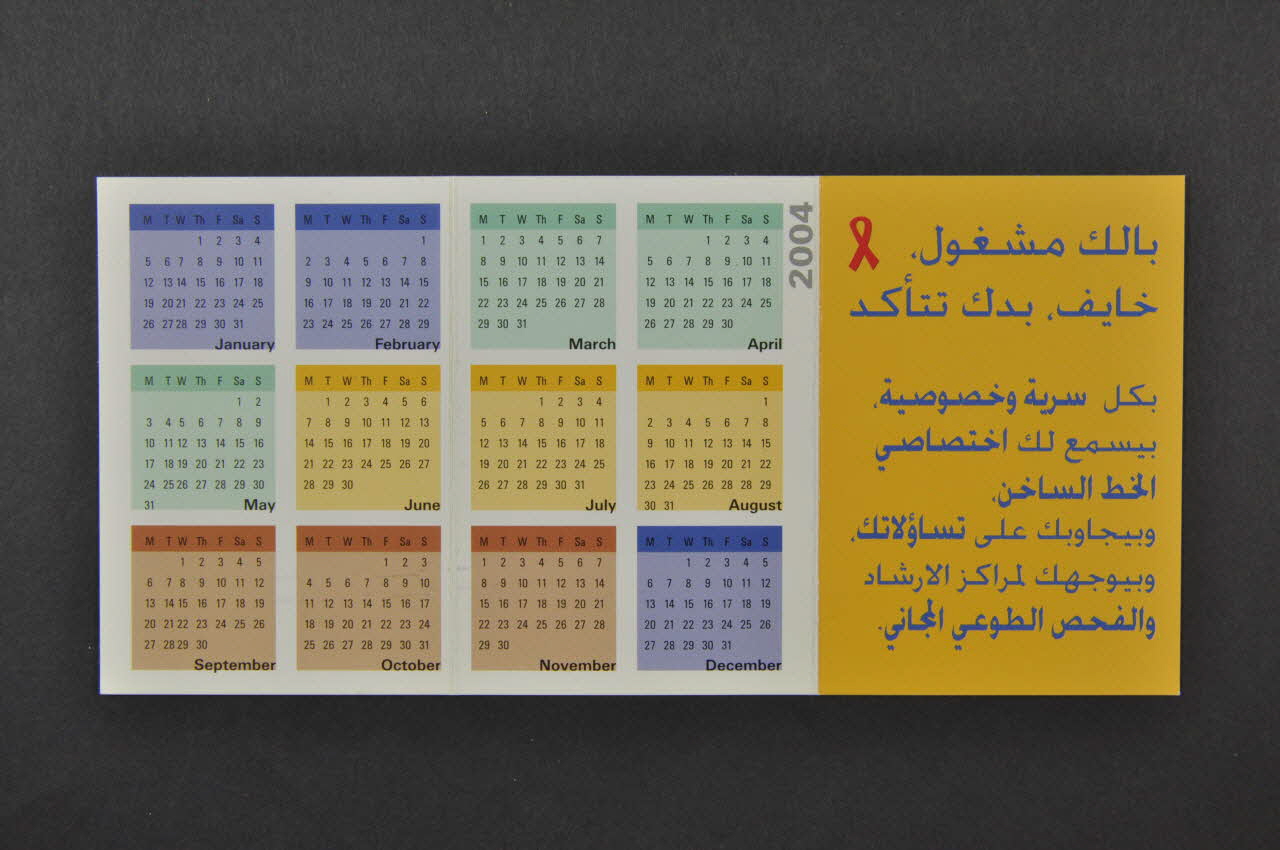 Le recto présente un fond orangé surimprimé d'un gros ruban rouge (symbole de la lutte contre le sida) placé à droite et imprimé au format portrait. Des inscriptions en arabe (non transcrites) sont imprimées en bleu dans la partie gauche. Un bandeau bleu clair est imprimé le long de la bordure inférieure, avec des inscriptions blanches en surimpression. Un logo est placé à chaque extrémité du bandeau. Au verso, le fond orange est visible avec une inscription bleue en arabe (non transcrite) au centre. Le bandeau bleu du recto continue sur le verso, avec des inscriptions blanches horizontales en surimpression. A l'intérieur, deux feuillets montrent un calendrier imprimé en couleurs. Chaque mois est présenté avec les inscriptions chiffrées des jours en noir en surimpression dans un cadre coloré (mois d'hiver en violet, mois de printemps en vert, mois d'été en jaune et mois d'automne en marron). Le troisième feuillet porte une inscription en caractères bleus sur un fond orange uni. Elle est précédée d'un petit ruban rouge.Inscriptions