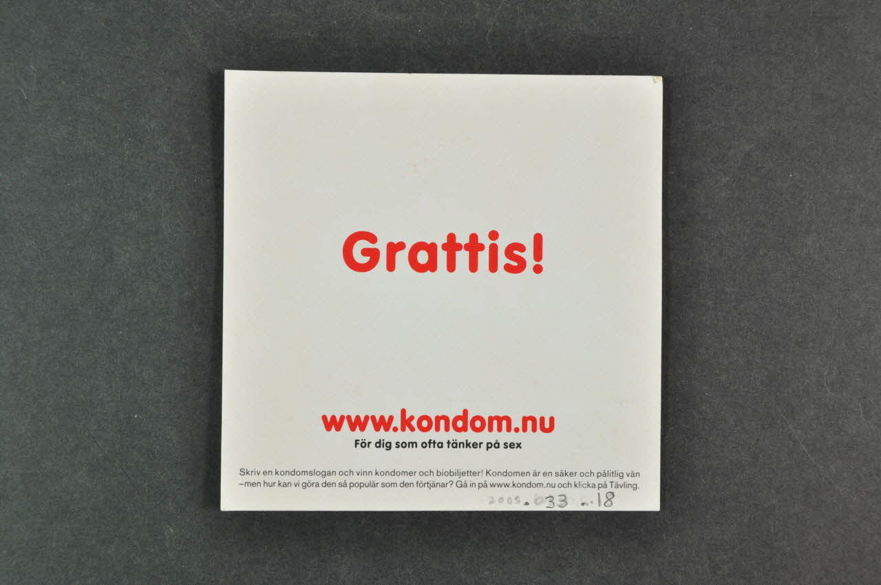 Grattis ! // www.kondom.nu // För dig som ofta tänker pa sex (inscription en rouge et en noir sur fond blanc), versoDécor