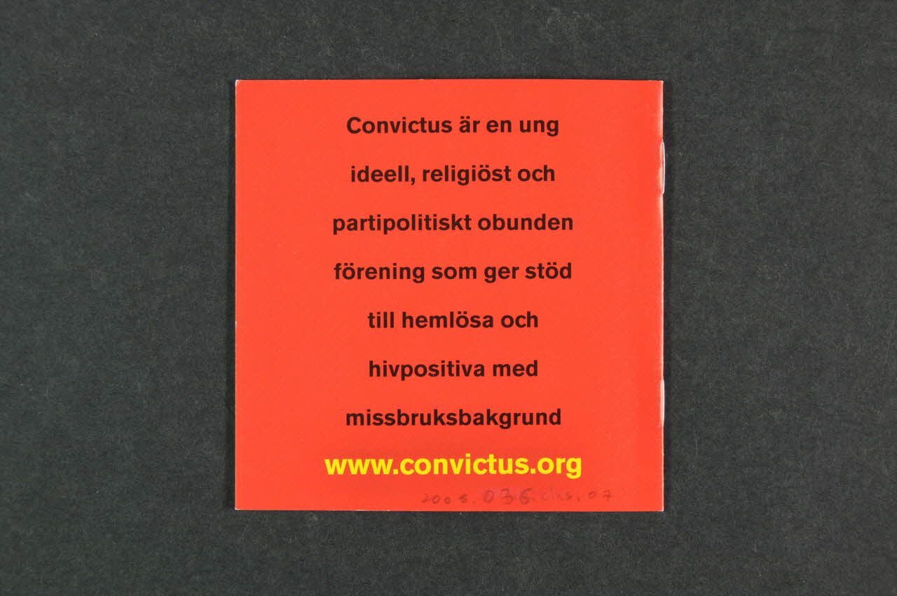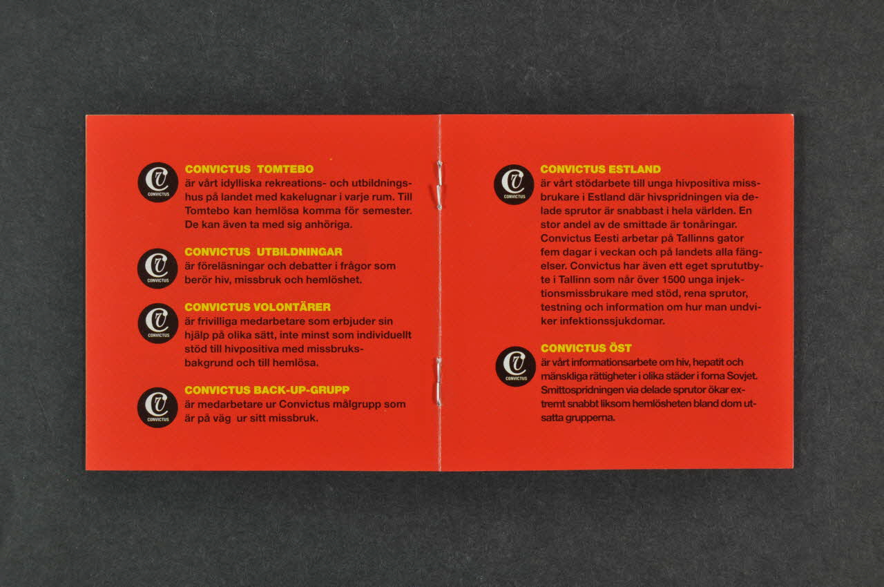 Vi tar tacksamt // emot hjälp i form av // pengar, kläder, skor, // kaffe, sängkläder, // sanitetsartiklar. (Texte de la sixième page imprimé en caractères noirs sur fond blanc), à l'intérieurConvictus Tomtebo // Convictus Utbildningar // Convictus Volontärer // Convictus Back-Up-Grupp // Convictus Estland // Convictus Öst (Texte des pages 3 et 4 imprimé en noir sur fond rouge et constitué de six paragraphes. Les six titres sont imprimés en capitales jaunes.), à l'intérieurLogo