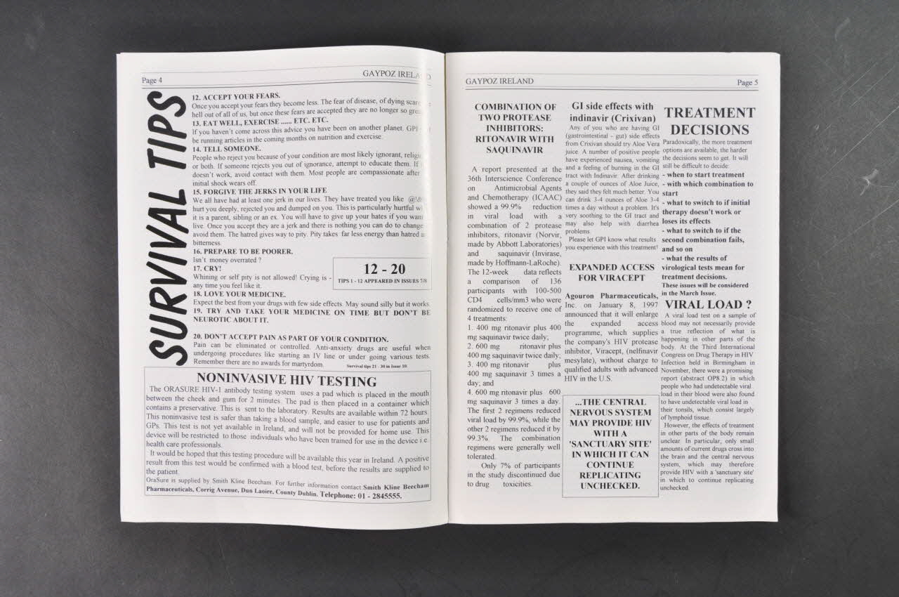 - p.2 Nouvelles associations ... Nouvelles préoccupations (résistances, interactions, quand commencer le traitement) - p.3 Test de dépistage du VIH non invasif ( test buccal non autorisé en Irlande) - p.3 Sites internet sur le sida - p.3 Conseils de survie (conseils numérotés de 12 à 20 , bien manger, en parler, prendre ses remèdes à temps etc...) - p.5 Reconsidérer le test de la charge virale (passage dans le cerveau et le système nerveux) - p.5 Effets secondaires de l'Indinavir (Crixivan), comment les combattre - p.6 Conférence de Washington sur les rétrovirus - p.7 Nouveaux médicaments contre le VIH - p.7 Tableau de résistances croisées - p.8 Brèves nouvelles dans les médias - p.9-10 Glossaire - p.11 SPV-30 Résultats prometteurs (thérapie naturelle complémentaire à base de plantes essayée par des membres de l'association) - p.11 Lettre interassociative envoyée par GPI pour demander à Glaxo Wellcome un programme d'accès à un nouveau traitement - 1592 - p.12 L'attorney Act 1996 (Document légal donnant le pouvoir à une personne en cas de perte de ses capacités mentales)