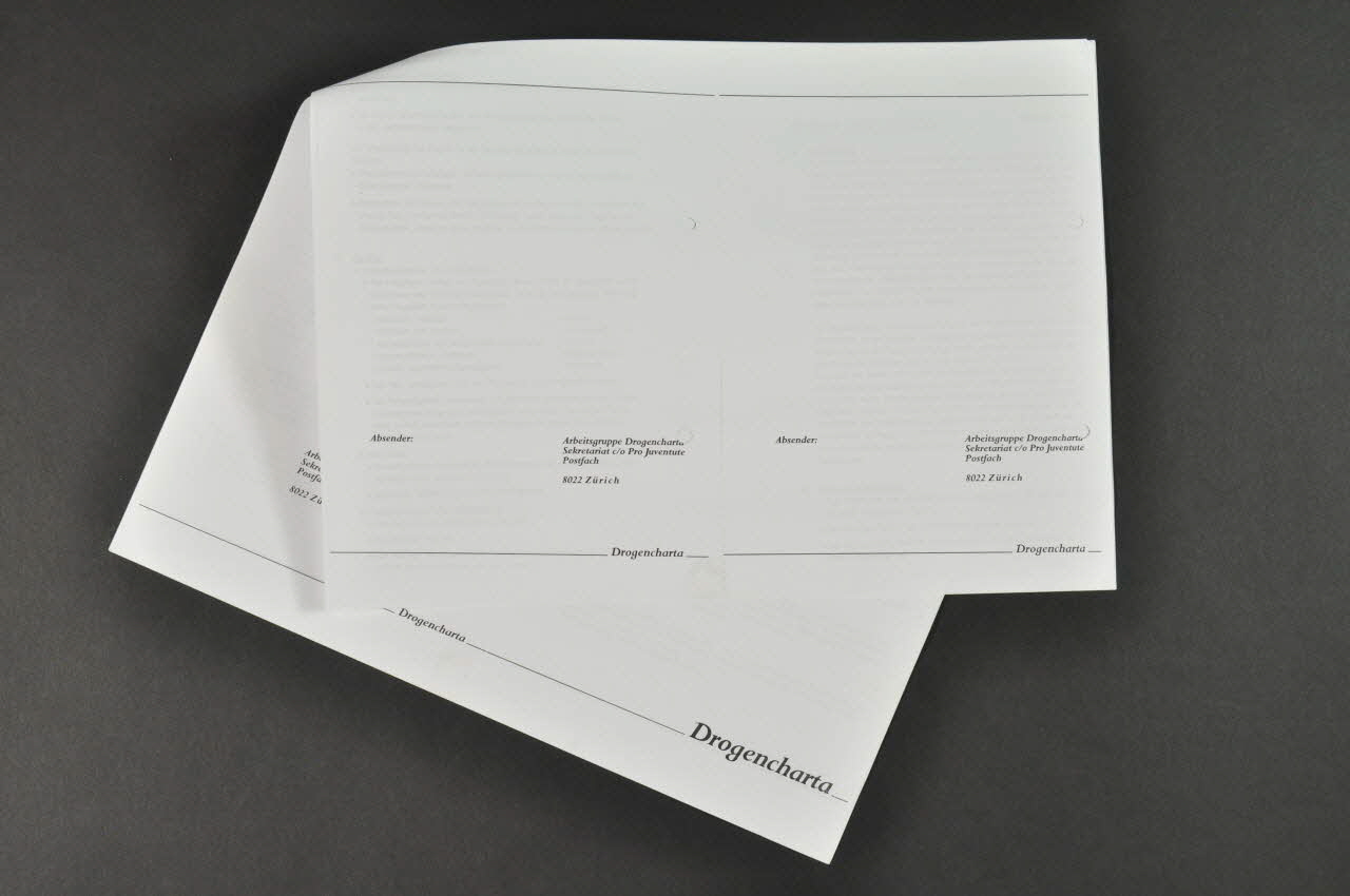 Arbeitsgruppe Drogencharta // secrétariatc/o Pro Juventute // Postfach // 8022 Zürich, sur la couvertureDécor