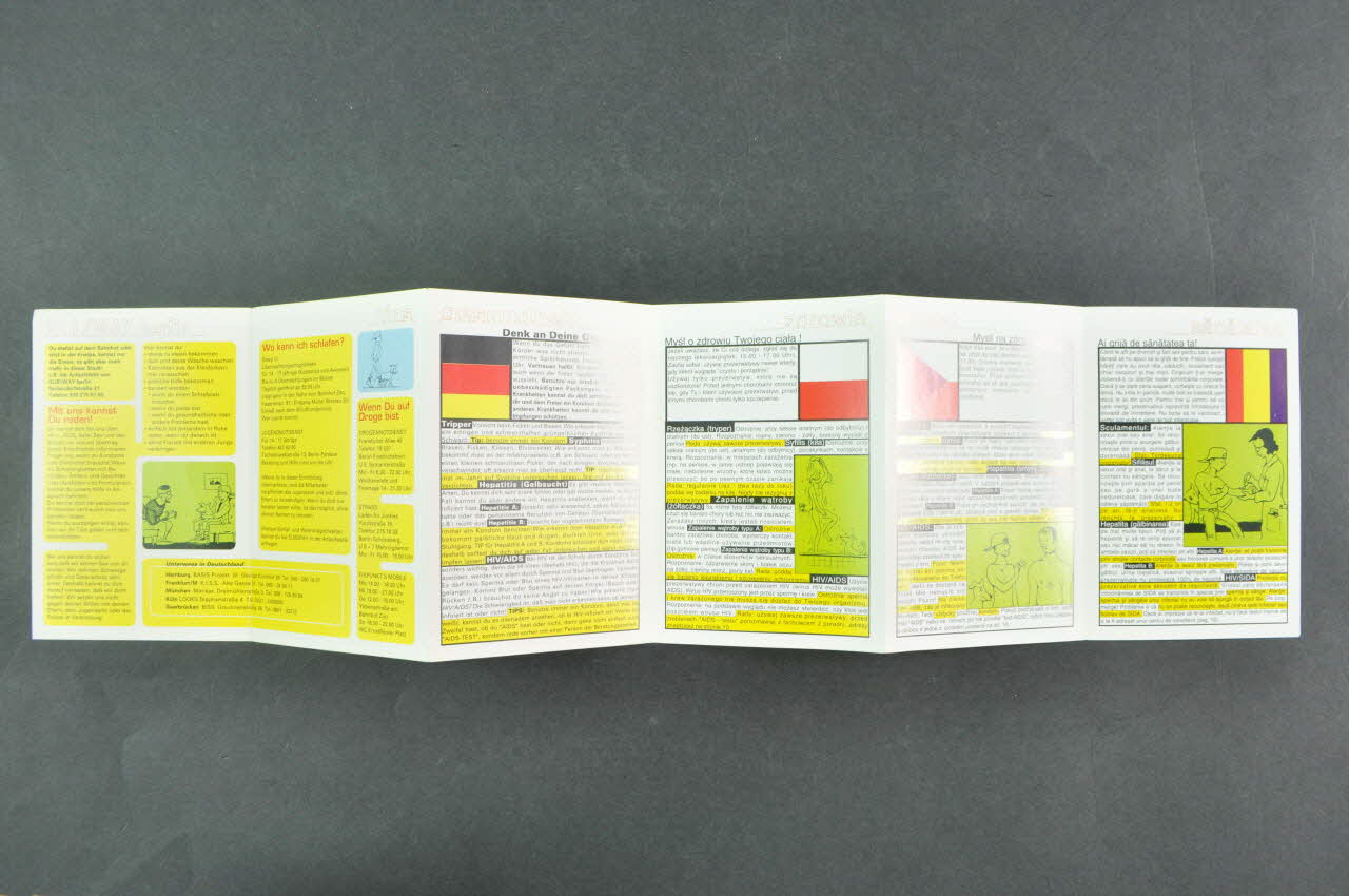 Sur la couverture on trouve un plan d'un quartier de Berlin et une photographie d'un bâtiment. Le titre est en haut avec le dessin d'un homme à casquette rouge et son chien. En bas on trouve quatre drapeaux indiquant les différentes langues utilisées dans le dépliant (allemand, polonais, tchèque, roumain). A l'intérieur le dépliant est organisé en petits encarts jaune sur les deux premiers volets, ils sont en allemand. Ensuite on retrouve le même texte en quatre langues sur quatre volets avec les passages importants surlignés en jaune. Au verso la composition est toujours quadrilingue avec des dessins humorisitiques. Sur le dernier volet on trouve les horaires des permanances de l'association et son adresse.Inscriptions