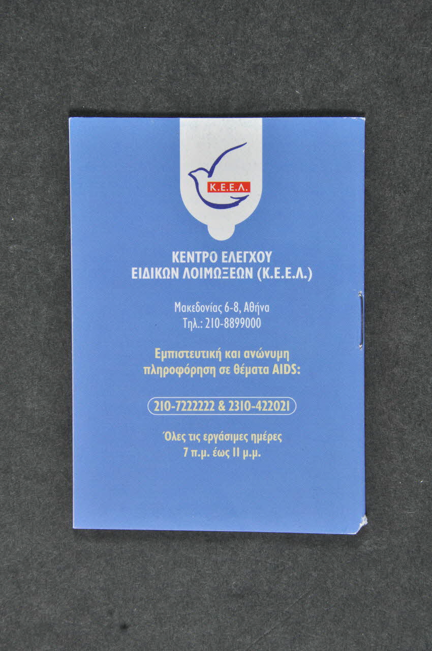Au verso, sur fond bleu, on retrouve ce logo dans un preservatif blanc dans la partie supérieure. Il y a des coordonnées mentionnées au centre du verso.