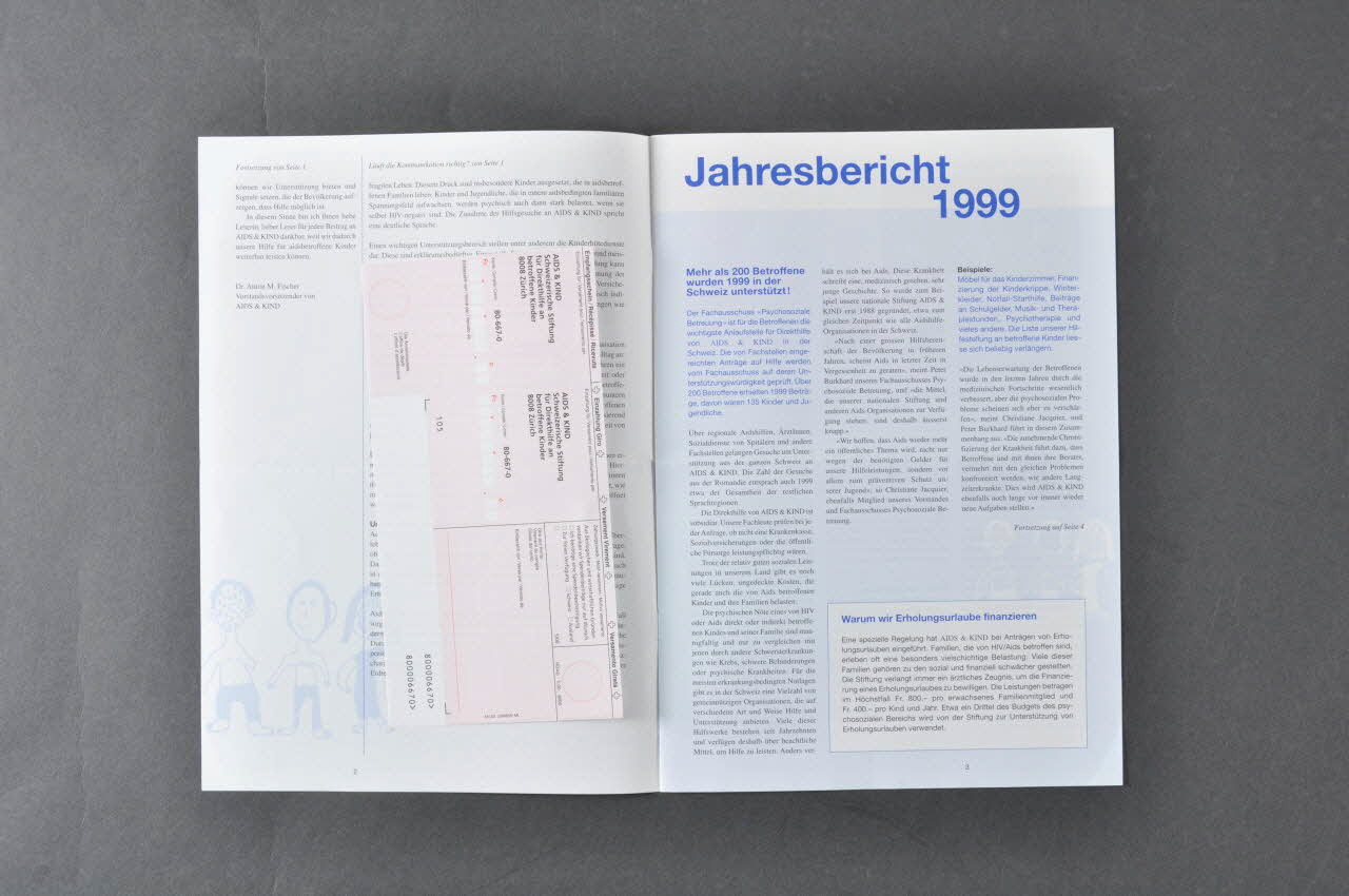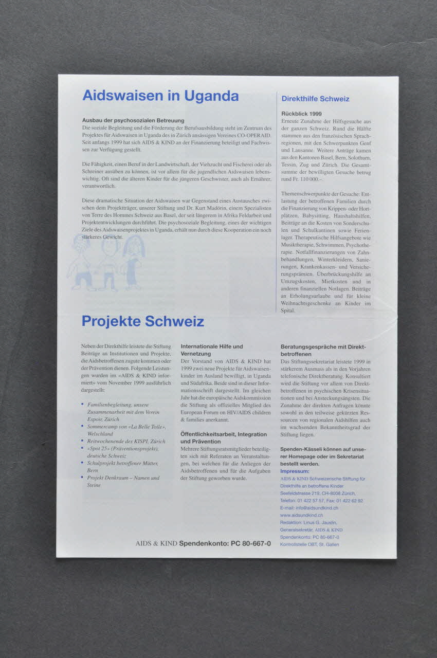 La première page présente, sur un fond blanc, en haut, le titre du bulletin : "Aids & Kinds informiert (le sida et l'enfant. Information).