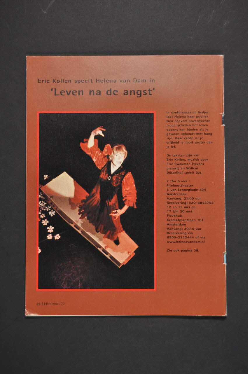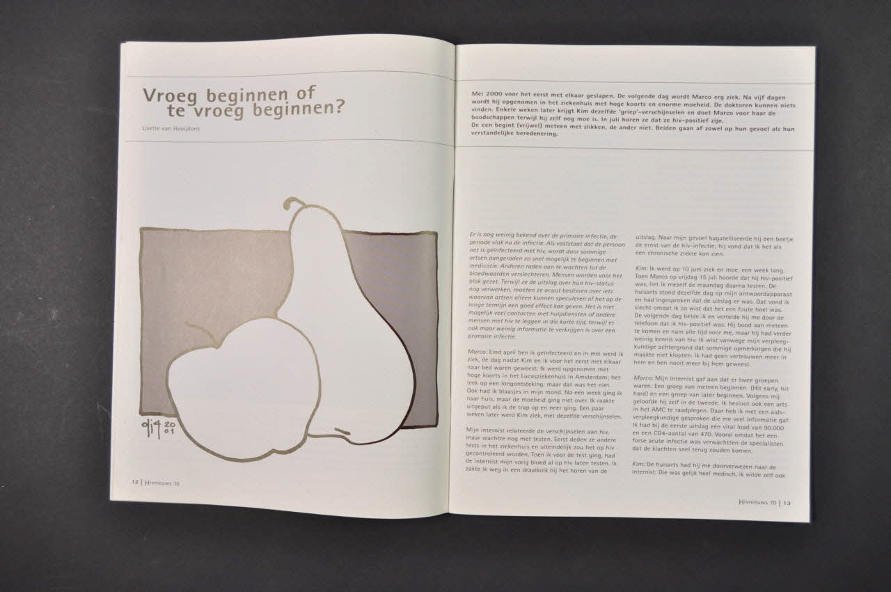 Revue de l'association HIV VERENIGING tirée à 2650 exemplaires. - p. 4-8 Verantwoordelijkheid voor jezelf nemen. Ervaringen met PEP na een condoomongeluk (Sur la prophylaxie post exposition) - p.9-11 "De tradities vermoorden ons" (Kenya) - p.12-15 Vroeg beginnen of te vroeg beginnen ? (témoignage ?) - p.16-18 We moeten tot het uiterste strijden. Succesbvol Braziliaans aidsbeleid - p.19 Oegandese president discrimineert - p.20-21 Overwinning in rechtszaak Zuid-Afrika - p.22-25 "Eigenlijk ben je al gepensioneerd" (témoignage) - p.26-27 Hiv moet ondetecteerbaar worden, niet onzichtbaar ! Canalparade 2001 (gay pride. Petites photos. - p.28-39 Een dameskilt met witte kousjes eronder - p.31 Nouvelles de l'association - p.32, 38 Accès aux traitements dans le monde et en particulier en Afrique - p.33 BD Goededagen slechtedagen.nl - p.34-35 Sociaal-juridische vraagbaak - p.35 Lettre de lecteur : "Aids-top Sint Pietersplein Rome" - p.36-37 Oh shit ! - p.39 Spectacle de Helena van Dam - p.40-43 "5 jaar combinatietherapie" (5 années d'antirétroviraux) Cf illustration et annonce de la couverture - p.44-45 Stoppen met prophylaxe (Sur la prophylaxie post exposition) - p.46 Snellere registratie hiv-remmers voor voorbehandelden - p.47 Trial met T-20 - p.48-51 Lipodystrofie : valt er iets aan te doen ? - p.52-53 Nouvelles médicales - p.54 Nouvelles associatives