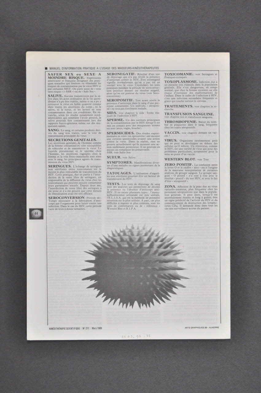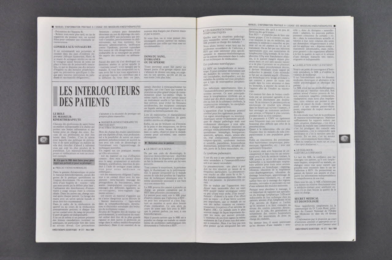Revue numérotée de 21 à 44: il s'agit d'un numéro de revue édité également à part. Sommaire: En première page : présentation des trois associations : ARCAT-SIDA, APS (Association pour la Prévention du Sida), FFMKR (Fédération Française des Masseurs Kinésithérapeutes Rééducateurs) Introduction Sommaire 1. Les nouveaux enjeux du sida - Information ou prévention : Où et comment s'informer ? / Le rôle des professionnels de santé / Le rôle de la presse / Le rôle des institutions publiques et privées / Le rôle des entreprises - Une épidémie mondiale / Les modes de contamination 2. L'infection à VIH - La séroconversion et l'incubation : Les formes mineures et intermédiaires / Le sida, forme majeure de l'infection à HIV / Les infections et cancers secondaires et l'atteinte du système nerveux - La classification du CDC d'Atlanta 3. La recherche - Les traitements : Contre les infections et les cancers secondaires / Traitements contre le HIV - Demain, un vaccin ? 4. Les tests de dépistage - Signification des tests : Le test doit être un choix personnel / Etre séropositif n'empêche pas d'être à nouveau contaminé - Les nouveaux types de tests - Test et transfusion sanguine - Le dépistage systématique - Le dépistage orienté 5. La prévention - La prévention est l'affaire de tous : Les principes de la prévention / Qui est menacé ? - Les modes de transmission du VIH : La voie sanguine / La voie sexuelle / La voie materno-foetale - Prévention et sexualité : Le sexe à moindre risque (La réduction du nombre des partenaires / L'utilisation des préservatifs / Les rapports oraux-génitaux) - Prévention et toxicomanie - Prévention et maternité - Prévention et vie quotidienne - Prévention et professions de santé : Quelles sont les précautions élémentaires à prendre ? / Que faire en cas de blessure accidentelle ? - Conseils aux voyageurs - Dons du sang, d'organes ou de sperme 6. Les interlocuteurs du patient - Le rôle du masseur-kinésithérapeute : Précautions normales / Masseur-kinésothérapeute pratiquant d'autres techniques / Le droit aux soins / Les manifestations symptomatiques (Syndromes neurologiques / Syndrome pulmonaire) / La relation avec le patient / Le dialogue, clef de la confiance. - Secret médical et déontologie 7. La couverture sociale : La déclaration obligatoire / L'hôpital de jour / L'hospitalisation à domicile / Les maisons de repos / Les appartements de relais thérapeutique et social 8. Les associations : Les principales associations intervenant contre le sida / Associations associées à la lutte contre le sida / Associations étrangères 9. Bibliographie / Informations pratiques (Centres de documentation et d'information du public / Le Sida sur Minitel / Les consultations spécialisées / Consultations de dépistage anonyme et gratuit) Lexique.