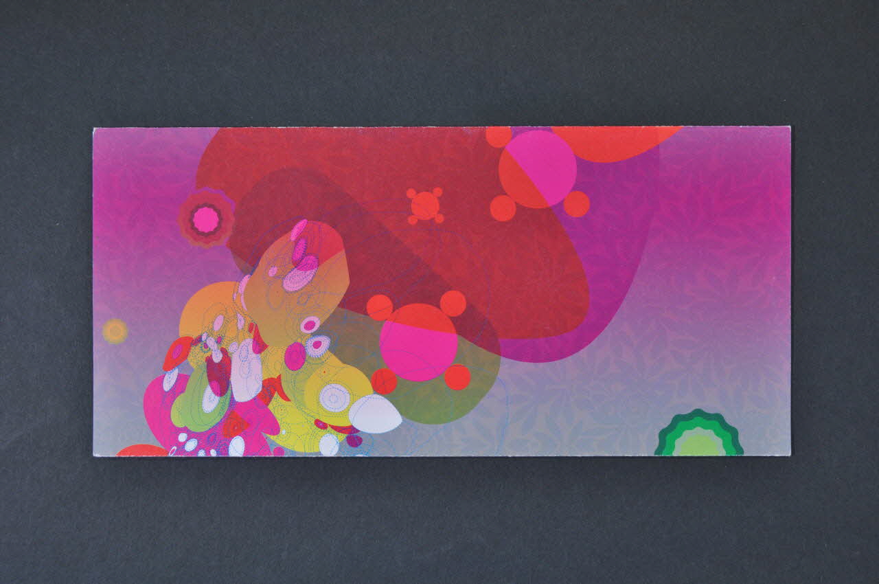 Le dépliant, de forme rectangulaire, présente une illustration graphique au recto et au verso: on y voit des motifs végétaux bleus-gris et par-dessus des éléments ovales et circulaires de couleurs violettes,orange, rose, vertes et jaunes. Le titre est en carctères blancs.