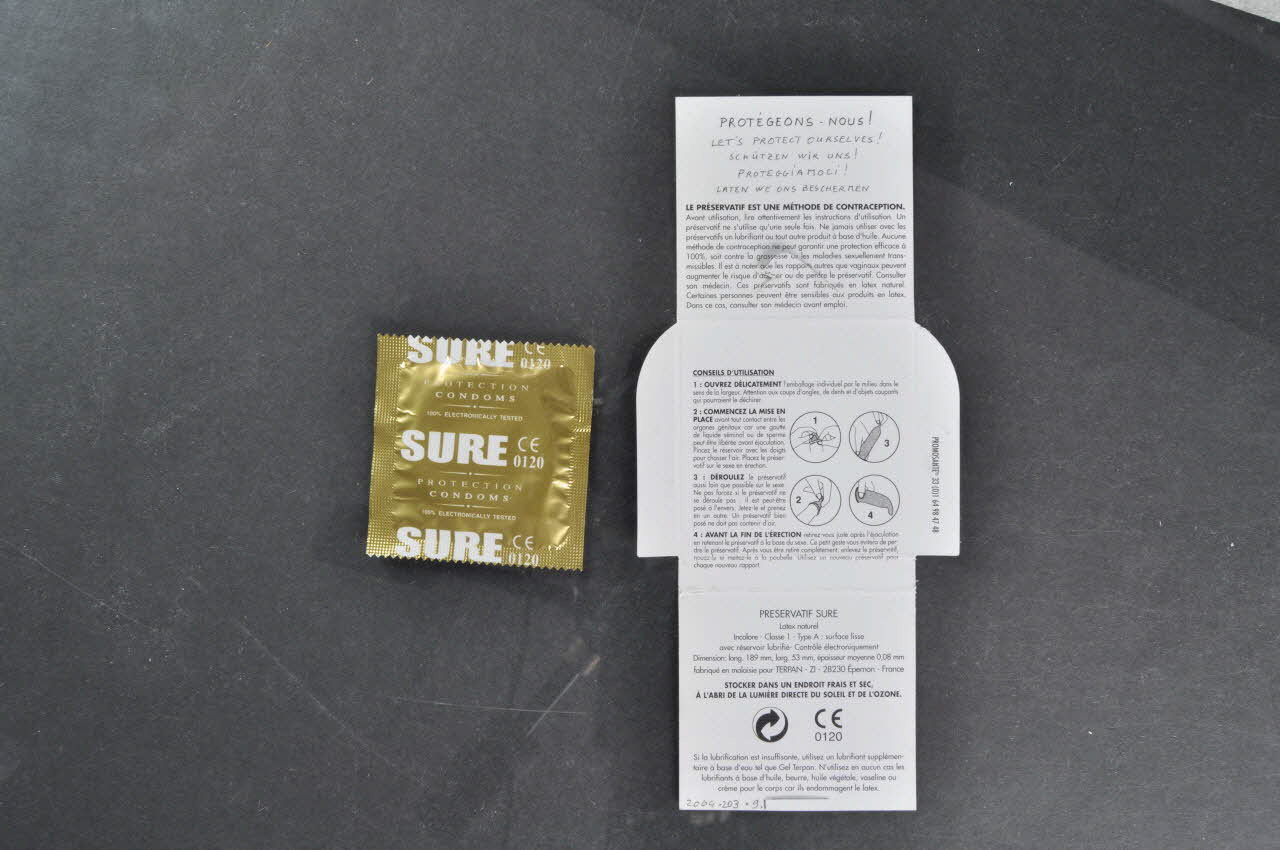 A l'intérieur, on retrouve le slogan en français, anglais, allemand, italien, flamand, des recommandations, des conseils d'utilisation en quatre petits schémas légendés, des renseignements sur le préservatif SURE fabriqué par Terpan.