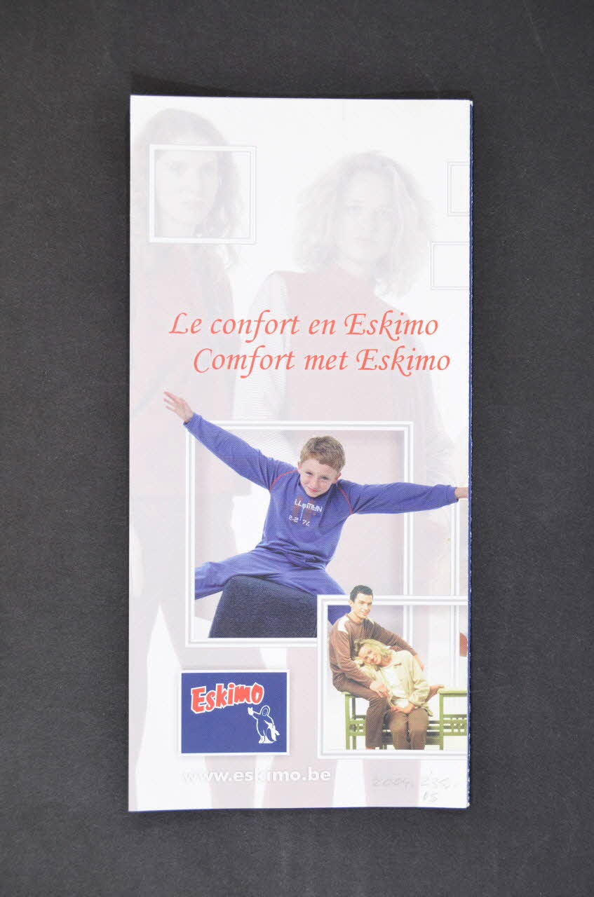 Sur la couverture à fond bleu il y a en haut une reproduction de l'affiche 2004.239.01 avec en haut, en caractères blancs, en français et en flamand le nom de l'association puis le nom de la marque et un slogan. En bas, il y a un dessin en blanc d'un eskimo avec un pingouin à côté de lui, brandissant un petit ruban rouge. Au dos sur un fond blanc il y a en sous impression des jeunes femmes en sweat, en surimpression il y a deux photos couleur d'un garçonnet et d'un couple en pyjama. En bas, à gauche, il y a le logo et l'adresse internet de la marque. A l'intérieur il y a quatre feuillets, les trois premiers ont un fond gris avec un slogan en rouge, un texte en noir, blanc et bleu et une scultpure de cactus. Sur le dernier volet on a des photos de slips dames et hommes devant et derrière. Sur l'autre face on a des photos de la collection de la marque.Inscriptions