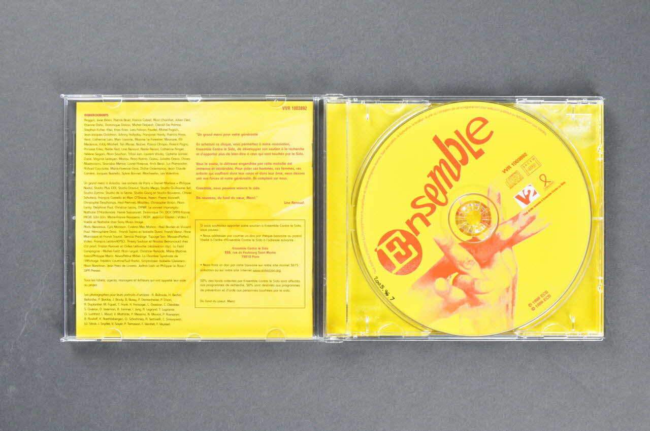 Le couvercle contient le livret. Celui-ci est formé de huit pages de papier glacé, reliées par deux agrafes métalliques. La couverture du livret est jaune, illustrée de deux mains entrelacées, encadrées des titre et noms des chanteurs. Le dos à fond jaune, présente en noir et brun : les remerciements avec un petit texte de Line Renaud. A l'intérieur, on trouve sur les pages 1 et 2, une frise de photographies couleur des artistes. Au dessus, est imprimé le texte de la chanson phare du CD, chantée par tous les artistes. Les pages 3 et 4 présentent les autographes des artistes, et les pages 5 et 6 les titres des chansons. A l'intérieur du boîtier est rangé le CD, de couleur jaune, présentant des impressions rouges, dont les deux mains entrelacées.Inscriptions