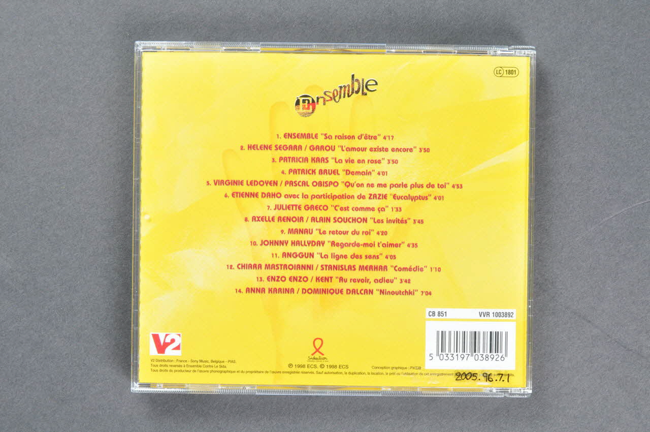 1. ENSEMBLE : "Sa raison d'être" / 2. Hélène SEGARA / GAROU : "L'amour existe encore" / 3. Patricia KAAS : "La vie en rose" / 4.Patrick BRUEL : "Demain" / 5. Virginie LEDOYEN / Pascal OBISPO : "Qu'on ne me parle plus de toi" / 6.Etienne DAHO avec la participation de ZAZIE : "Eucalyptus" / 7. Juliette GRECO : "C'est comme ça" / 8. Axelle RENOIR, Alain SOUCHON : "Les invités" / 9. MANAU : "Le retour du roi" / 10. Johnny HALLYDAY : "Regarde-moi t'aimer" / 11. ANGGUN : "La ligne des sens" / 12. Chiara MASTROIANNI / Stanislas MERHAR : "Comédie" / 13. ENZO ENZO / KENT : "Au revoir, adieu" / 14 Anna KARINA / Dominique DALCAN : "Ninoutchki" (contenu du CD :)"Sa raison d'être" / Elle en a vu de toutes les douleurs / Elle est revenue de tant de combats / Elle a tellement tendu son coeur / Là où d'autres ont baissé les bras // Elle dit qu'après certains regards / Les mots deviennent dérisoires / On fait les choses parce qu'elles s'imposent / Sans se demander pourquoi // C'est peut-être / Une goutte dans la mer / C'est peut-être / Une goutte d'eau dans le désert / Oui mais c'est sa raison d'être / sa raison d'être // Oh, elle en a essuyé des yeux / Elle en a baissé des paupières / Oubliant même que le ciel est bleu / A tant se pencher dans la poussière // Elle dit qu'on peut toujours trouver / Des excuses pour ne pas bouger / Elle, elle préfère encore se taire / Et faire ce qu'elle a à faire // C'est peut-être / Une goutte dans la mer / C'est peut-être / Une goutte d'eau dans le désert / Oui mais c'est sa raison d'être / sa raison d'être // Oh, elle en a brisé des silences / Poussé des cris contre des murs / Avec pour échos l'indifférence / Et des rancunes encore plus dures. // Car aujourd'hui, si l'existence ici / Ne se limite qu'à la survie / Il faut savoir qu'une aile de papillon / Peut tout changer pour de bon // C'est peut-être / Une goutte dans la mer / C'est peut-être / Une goutte d'eau dans le désert / Oui mais c'est sa raison d'être / sa raison d'être. (Paroles de la chanson.)Décor