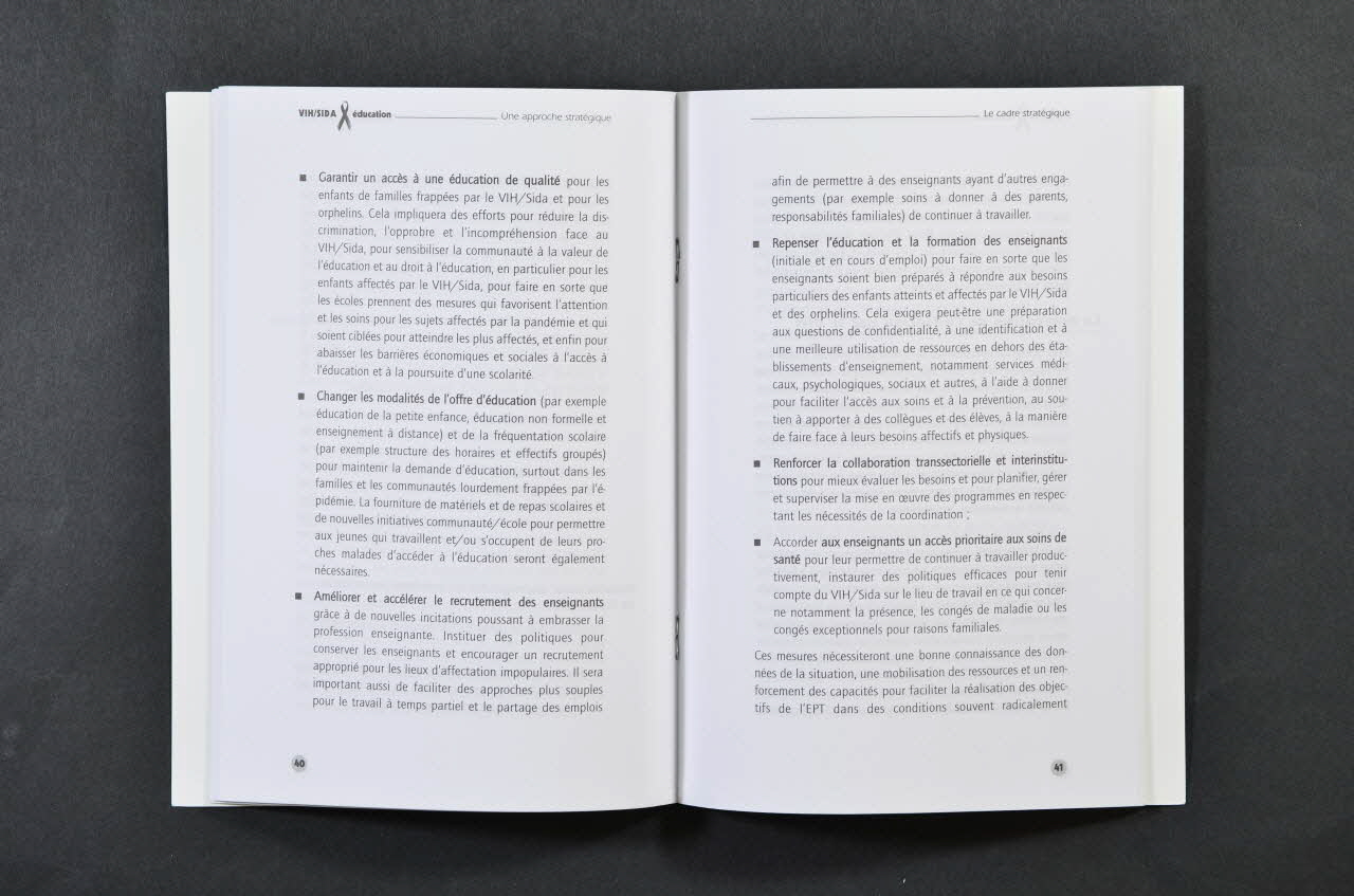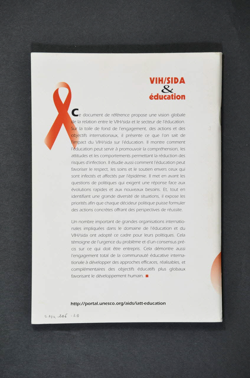 La couverture présente, dans sa partie haute, la photograohie d'enfants à l'école. Les deux enfants sont devant un livre ouvert pendant qu'un autre enfant les regarde à travers un grillage. La partie basse est figurée du ruban rouge sida horizontal ainsi que de plusieurs logos d'associations. Le dos de la brochure présente un texte précédé du ruban rouge sida. L'intérieur est constitué de textes sous forme de paragraphes. Le haut des pages contient le nom de la brochure ainsi que des grands titres des parties.Inscriptions