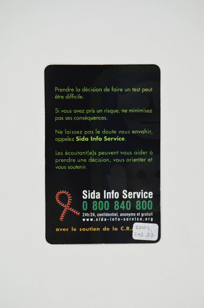 Sida Info Service // 0 800 840 800 // 24h/24, confidentiel, anonyme et gratuit // www.sida-info-service.org (Dans la partie inférieure, en blanc et vert sur fond noir), versoDécor