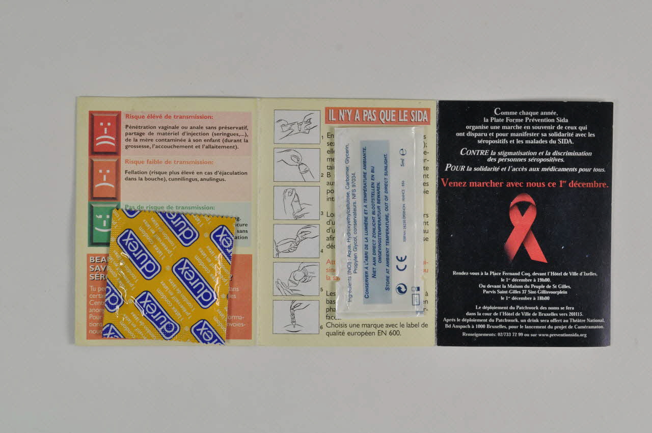 - sur le 1er volet : conseils sur la transmission (élevé, faible, sans), en couleur. Un préservatif contenu dans une enveloppe carrée jaune y est collé.