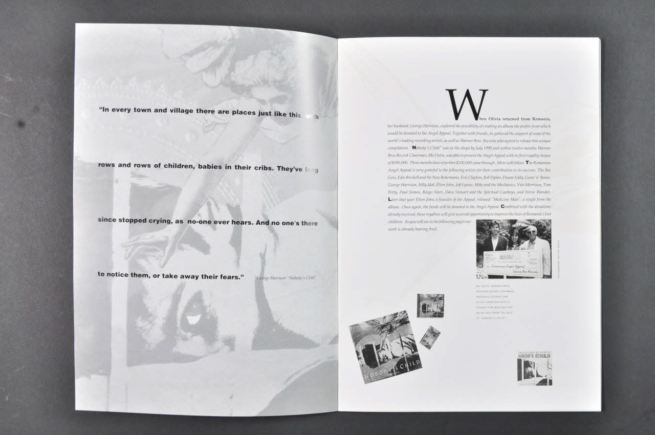 Brochure de récolte de fonds avec l'historique de la création de l'association. Découverte de la situation épouvantable des orphelinats roumains à la chute de Ceausescu en 1989. Fondation du "Romanian Angel Appeal" par Olivia Harrison. But : rénovation des orphelinats et des institutions pour les enfants abandonnés, orphelins et malades. Collecte en 6 semaines d'un million de livres auprès du public anglais et avec l'aide de Barbara Bach-Starkey, Elton John, Yoko Ono et Linda Mc Cartney. Premier convoi jusqu'à Bucarest en mai 1990. Ensuite, album créé par George Harrison avec d'autres artistes auprès de la Warnet Bros : "Nobody's Child" vendu au profit de l'"appel" en juillet 1990. Historique des acivités : rénovation des orphelinats, amélioration de la situation des enfants. Les activités concernent tous les enfants des orphelinats et non uniquement les enfants malades du sida. La page 12 est plus particulièrement consacrée au sida.
