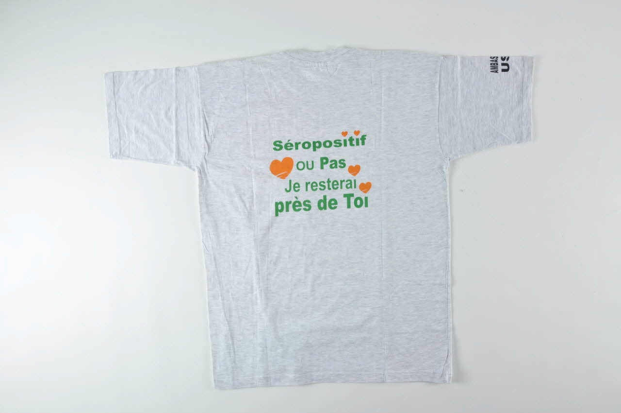 Tee shirt gris à manches courtes et encolure ronde, ornée sur l'avant d'une carte de l'Afrique verte prenant la forme d'une paume de main, à laquelle est accroché un petit ruban rouge. Sous le ruban rouge, en lettres rouges, figure le nom de l'association .
