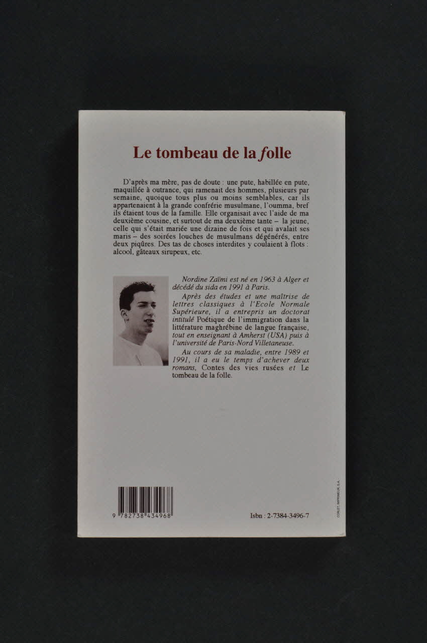 Nordine Zaïmi est né en 1963 à Alger et / décédé du sida en 1991 à Paris. / Après des études et une maîtrise de / lettres clasiques à l'Ecole Normale / Supérieure, il a entrepris un doctorat / intitulé "Poétique de l'immigration dans la / littéreture maghrébine de langue française" / tout en enseignent à Amherst (USA) puis à / l'université de Paris-Nord Villetaneuse. / Au cours de sa maladie, entre 1989 et / 1991, il a eu le temps d'achever deux / romans, "Contes des vies rusées" et "Le / tombeau de la folle". (Présentation de l'auteur sur la quatrième de couverture.)Nom de société