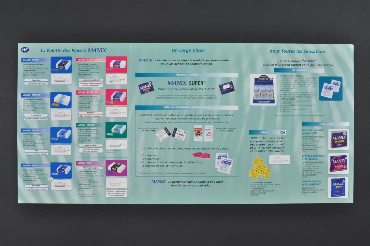 La couverture, sur un fond bleu-vert, se compose de textes en caractères blancs. Le logo de la marque se trouve en partie supérieure. En dessous, des informations sont dispensées sous trois titres de paragraphes : qualité, innovation, confort. En partie inférieure, sont visibles un slogan et l'adresse du site internet de la marque. Le dos est conçu de manière similaire. De haut en bas, un sous-titre, cinq paragraphes et divers logos et des coordonnées apparaissent. L'intérieur se déploie sur un fond vert clair. Le premier volet détaille, sur deux colonnes, les caractéristiques de chaque type de préservatifs Manix (taille , lubrifiant, réservoir, couleur...), à l'aide d'un texte accompagné de la photographie de la boite pour chacun. Le deuxième volet propose des produits personnalisés pour les actions de communication. Le troisième volet présente un gel lubrifiant, Senso (le préservatif européen développé par Ansell pour le secteur associatif et les collectivités locales) et des boites de préservatifs petits formats. Le rabat intérieur, constitué de deux encarts vert clair sur un fond vert-bleu, expose des statistiques mettant en valeur la marque ainsi que sa politique de communication. De nombreux logos apparaissent dans l'encart inférieur.Inscriptions