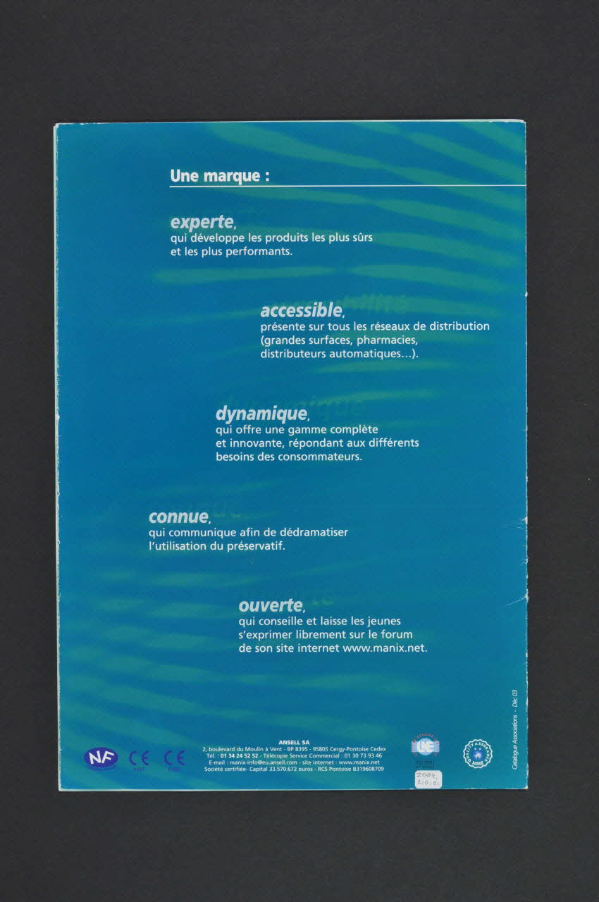 NF // CONTRÔLÉ PAR LNE // // CE // 0459 // // CE // 0086 (En partie inférieure, se trouvent divers logos liés à des normes: trois du côté gauche des coordonnées), versoMANIX© (Le logo de la marque est visible en partie supérieure, en grandes capitales blanches. Il est répété plusieurs fois à l'intérieur du dépliant.), sur la couvertureSYSTEME QUALITÉ CERTIFIÉ // LNE // ISO 9001 // n° 02041 // // QUALITY ASSURANCE // Ansell (En partie inférieure, se trouvent divers logos liés à des normes: deux du côté droit des coordonnées.), versoDate