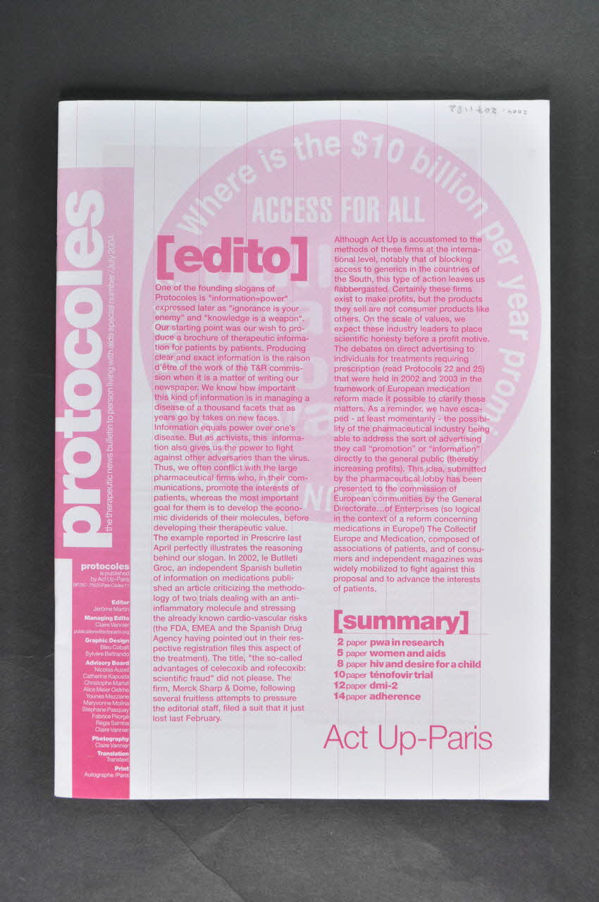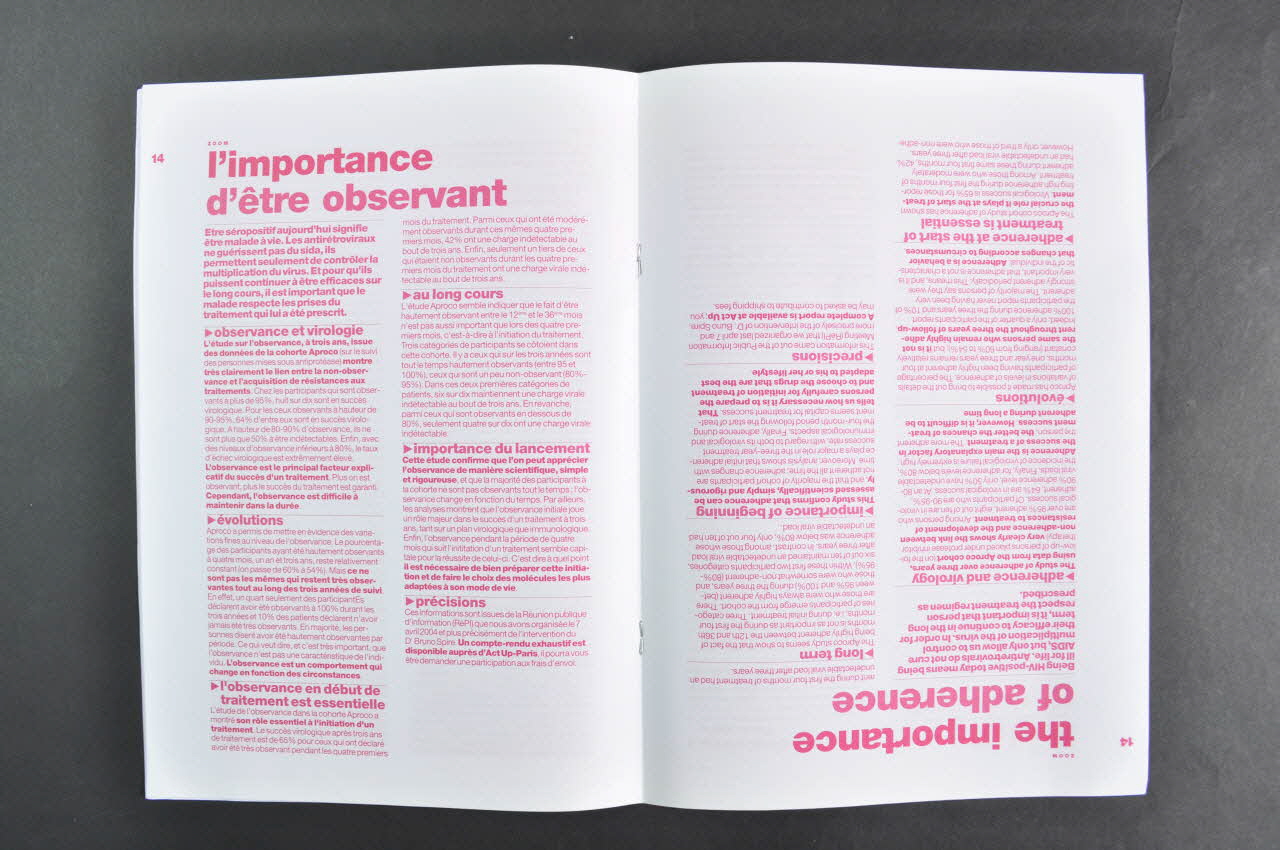 Revue de format A4, imprimée sur du papier blanc en rose. Editée tête bêche bilingue : un côté en français, un autre en anglais (même texte). La traduction en anglais s'explique sans doute par le fait que la revue était distribuée à Bangkok, à la Conférence mondiale du sida.