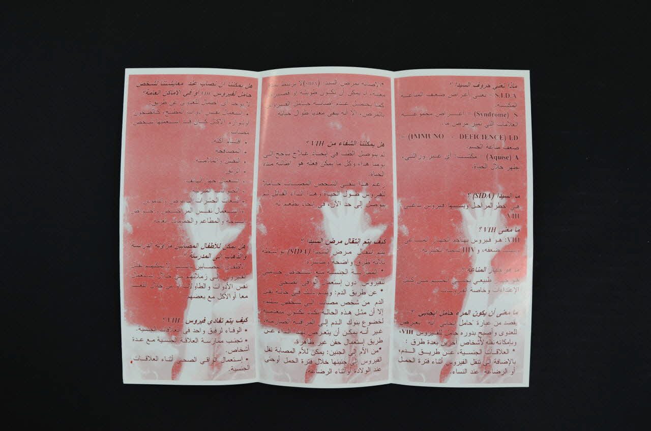La couverture comporte un fond blanc avec des inscriptions en noir. Au centre, figure un rectangle rouge avec un dessin en noir et blanc de deux jeunes gens les mains tournées vers le haut. Un petit ruban rouge est présent dans le coin supérieur gauche de l'image. Le dos du dépliant comporte la même image des deux jeunes gens les mains levées en l'air en sous impression sur un fond rouge pâle. La page est pourvue d'inscriptions en arabe et de logos d'associations. Les feuillets intérieurs sont dotés du même fond et d'inscriptions en arabe en noir sur l'ensemble.Inscriptions