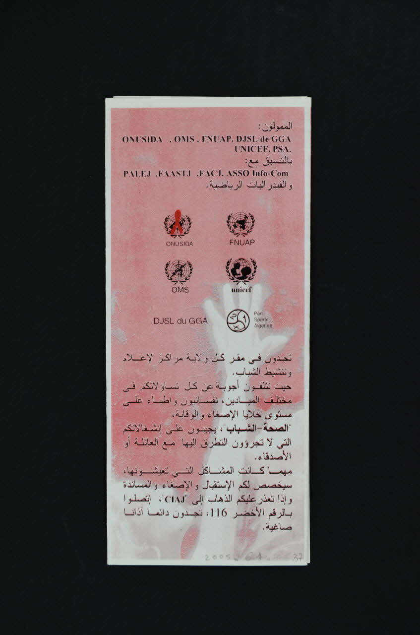 - ONUSIDA // - FNUAP // - OMS // - unicef // - DJSL du GGA // - Pari Sportif Algérien (six logos en noir au dos du dépliant), versoSommaire