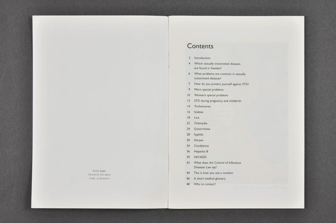 Contents // // 3 Introduction // 4 Which sexuality transmitted diseases // are found in Sweden? // 6 What problem are common in sexually // transmitted diseases? // 7 How do you protect yourself against STD? // 9 Men's special problems // 10 Women's special problems // 12 STD during pregnancy and childbirth // 14 Trichomonas // 16 Scabies // 18 Lice // 22 Chlamydia // 24 Gonorrhoea // 28 Syphilis // 30 Herpes // 34 Condyloma // 36 Hepatitis B // 39 HIV/AIDS // 43 What does the Control of Infectious // Diseases Law say? // 44 This is how you use a condom // 46 A short medical glossary // 48 Who to contact? (p. 1), à l'intérieurLogo