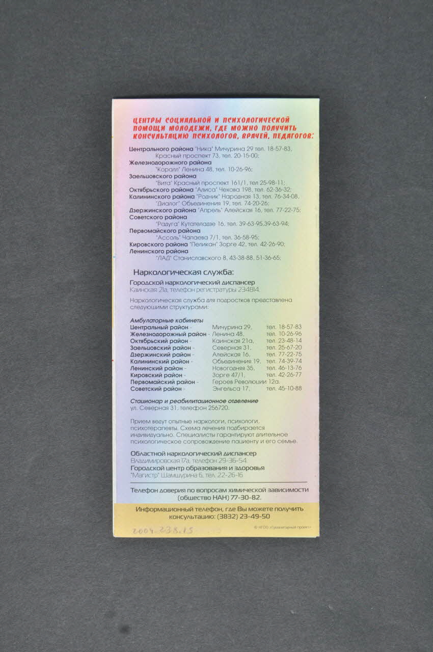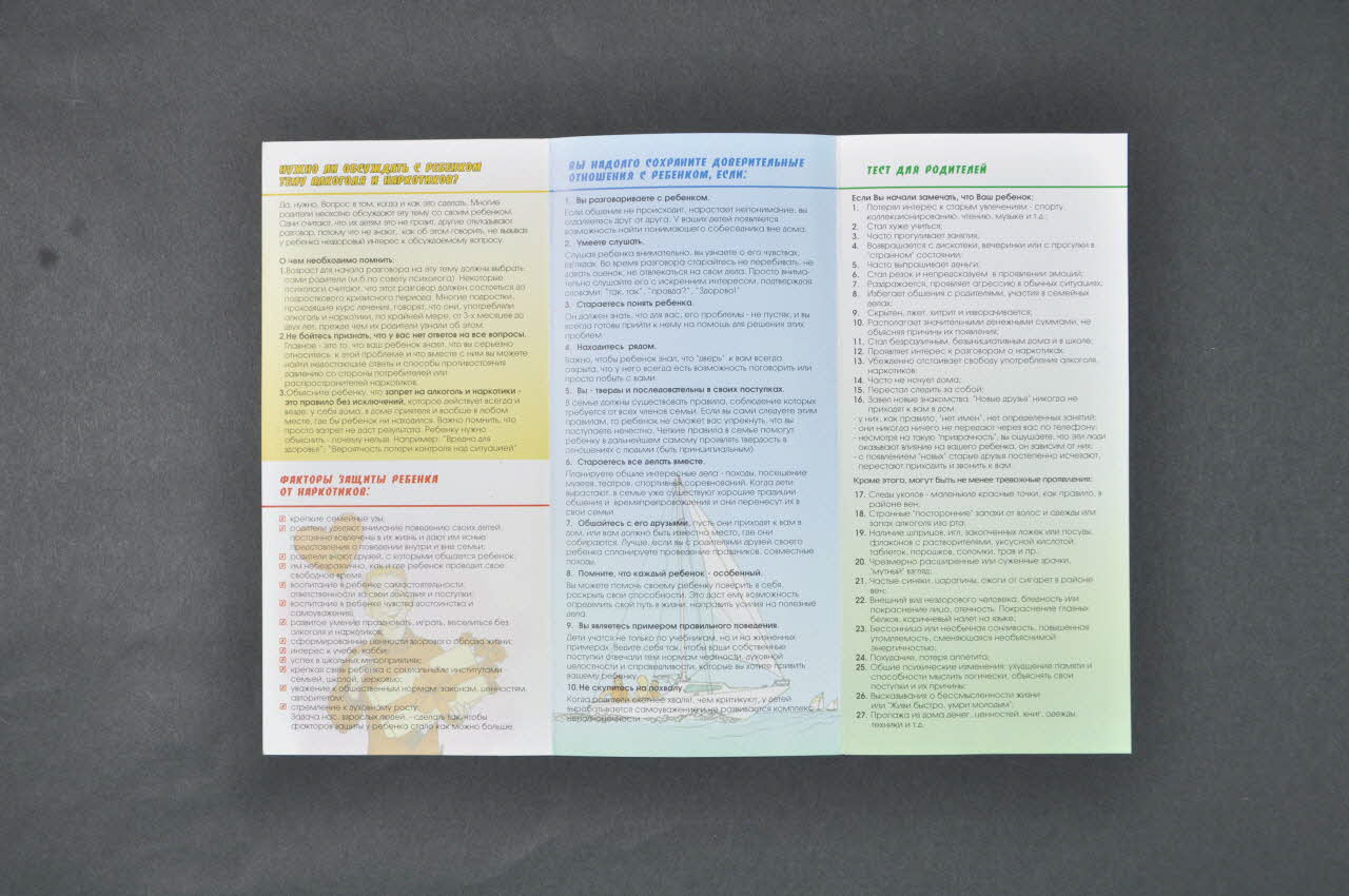 Réalisé en papier imprimé, le dépliant est de format A4 et plié en trois verticalement. Il porte des inscriptions en alphabet cyrillique.