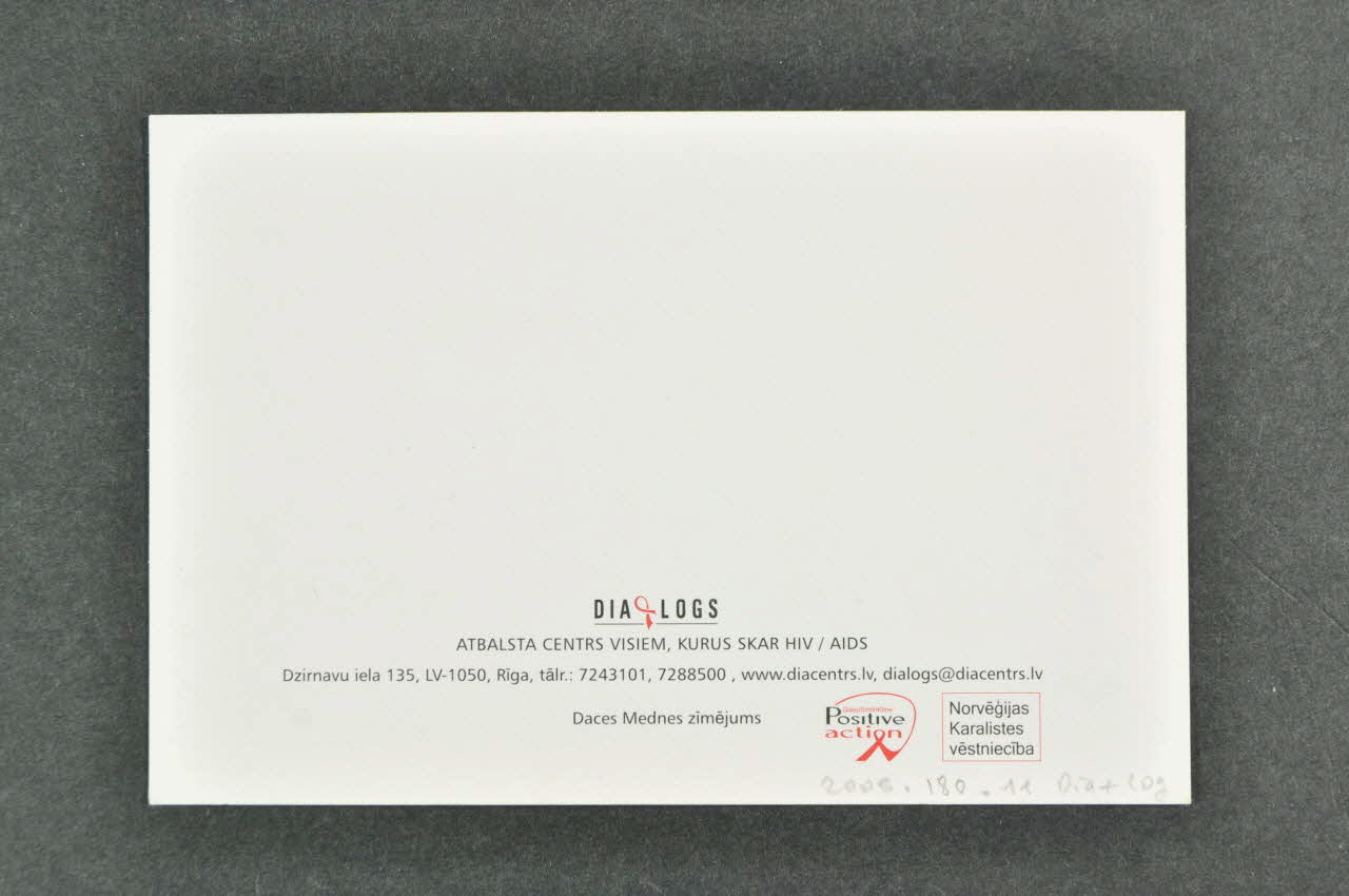 ATBALSTA CENTRS VISIEM, KURUS SKAR HIV / AIDS // Dzirnavu iela 135, LV-1050, Riga, talr. : 7243101, 7288500, www.diacentrs.lv, dialogs@diacentrs.lv (en bas), versoLogo