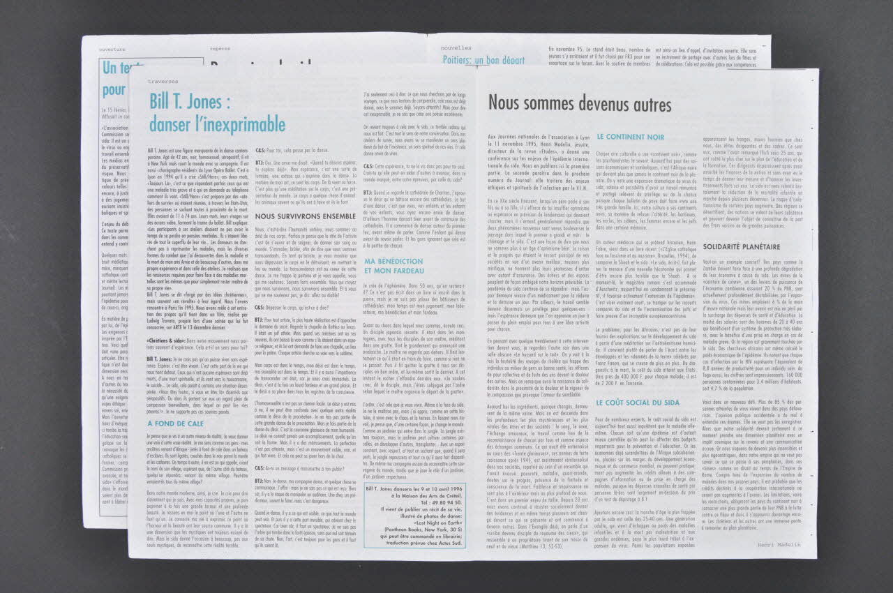 ouverture // un texte pour aller plus loin // // repères // antoine lion // pour vivre le sida à la face de dieu // // traverses // bill t. jones // danser l'inexprimable // // henri madelin // nous sommes devenus autres // // mosaïques // frédéric issenmann // l'abîme est habité (témoignage) (en première page)Date