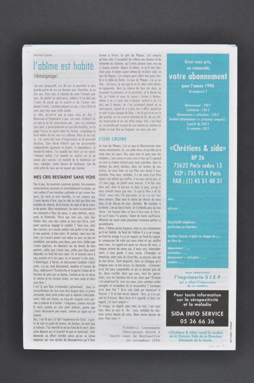 "Chrétiens & sida" // BP 26 // 75622 Paris cedex 13 // CCP : 735 95 A Paris (de la dernière page sur bandeau vertical bleu), à droiteAntoine Lion Ouverture. Un texte pour aller plus loin... (p. 2)Antoine Lion, Pour vivre le sida à la face de Dieu. (p. 2-3)Charles Péguy : Poème (p. 3)Henri Madelin (jésuite) Nous sommes devenus autres (p. 5)Antoine Lion "Pour lire le texte des évêques" (texte de la commission sociale de l'épiscopat :"Sida, la société en question" ( (...) "Une longue écoute des situations sous‑tend ce travail. Pourtant (...) l'expérience propre des chrétiens frappés par le V.I.H., ensemble ou dans leurs histoires singulières, semble peu reconnue comme un des "lieux théologiques" qu'offre notre société. Nulle évocation non plus de réalités très concrètes du monde du sida où les croyants ont un rôle à jouer : dimension symbolique des 1er décembre, importance des célébrations d'obsèques (p. 6)Adieu, Pierre Kneip (p. 6)Frédéric Issenmann L'abîme est habité (témoignage) ("L'abîme existe toujours mais je sais maintenant qu'il est habité. Au fond de l'abîme il y a un visage; au fond du visage, il y a un regard; au fond du regard, la compassion de celui qui nous aime et qui souffre avec nous." (p. 8)Décor