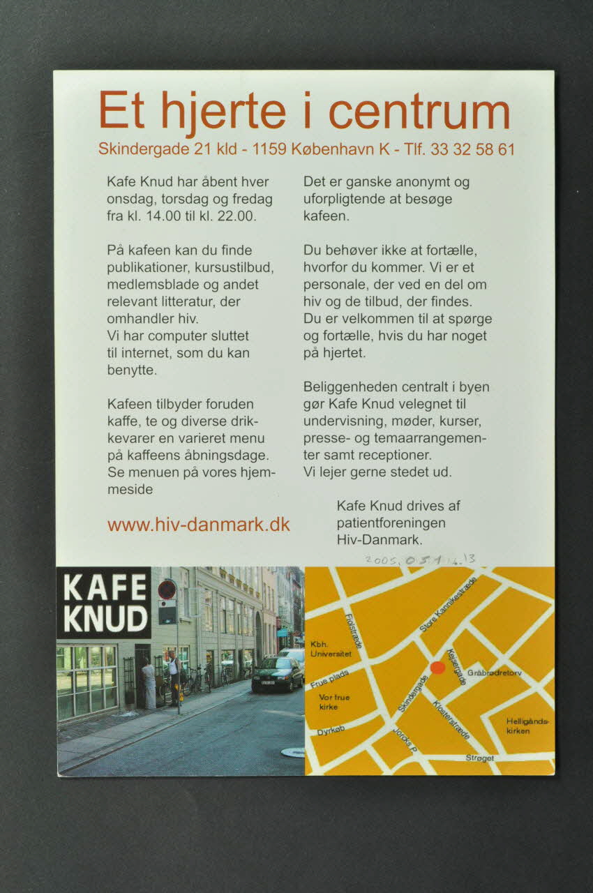 Au verso, sur un fond blanc, on peut lire en haut, en brun une phase en danois concernant le café ainsi que ses coordonnées. En dessous, il y a la présentation du café en caractères noirs sur deux colonnes et le site internet en brun. Il s'agit d'un lieu de sociabilité pour les personnes séropositives où l'on trouve des publications à disposition et internet.
