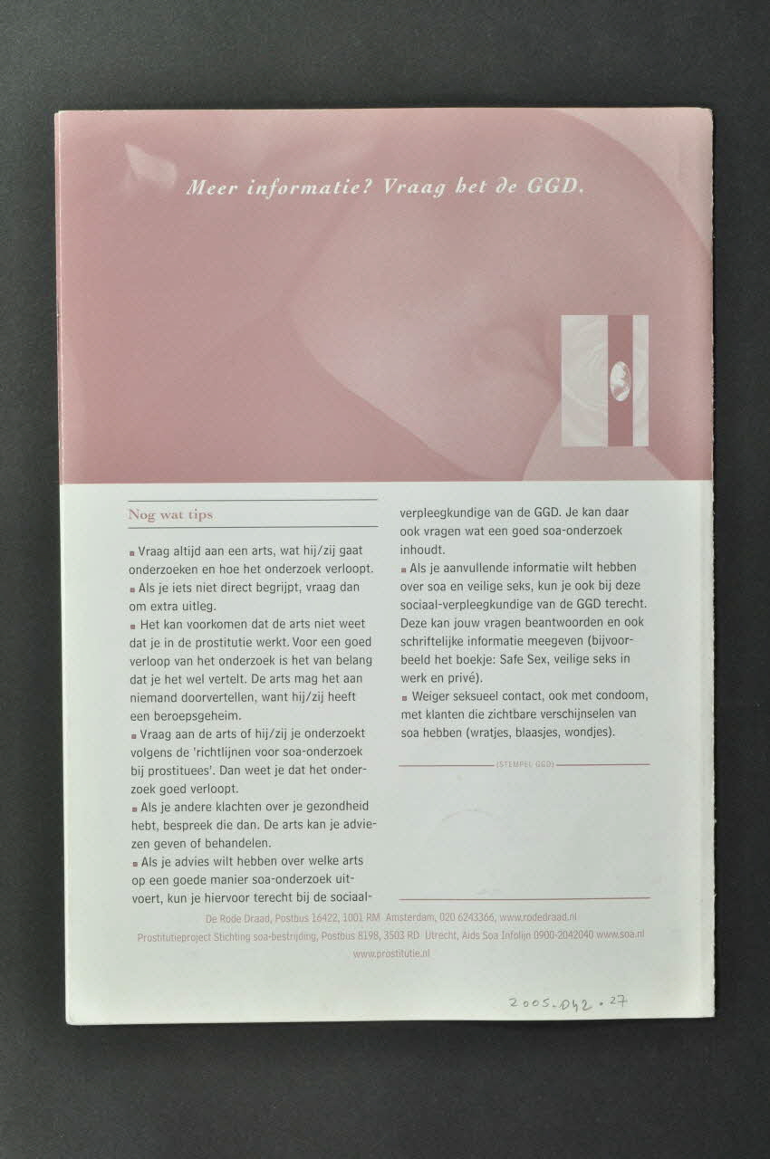 - Is het nodig om je op soa te laten onderzoeken als je altijd veilige seks hebt ? / Hoe vaak is soa-onderzoek nodig ? // - Regelmatig soa-onderzoek is nodig, ook als de seks altijd veilig is ! / Wanneer is het nodig om je tussen de regelmatige controles door op soa te laten onderzoeken? // - Mag een arts aan de exploitant vertellen dat je een soa hebt ? / Richtlijnen voor soa-onderzoek / Mag een arts aan de exploitant vertellen dat je een soa hebt ? // - Mag de exploitant je verplichten om aan hem de uitslag van het soaonderzoek te vertellen ? / Waar kan je terecht voor het soa-onderzoek ? // - Meer informatie ? Vraag het de GGD : Nog wat tipsDépliant : "Veel prostituees gan regelmatig naar de dokter..." (au fil du dépliant)Décor