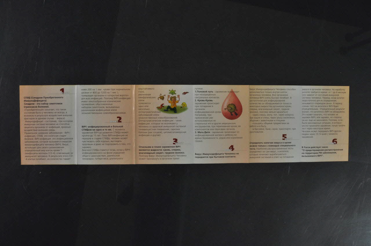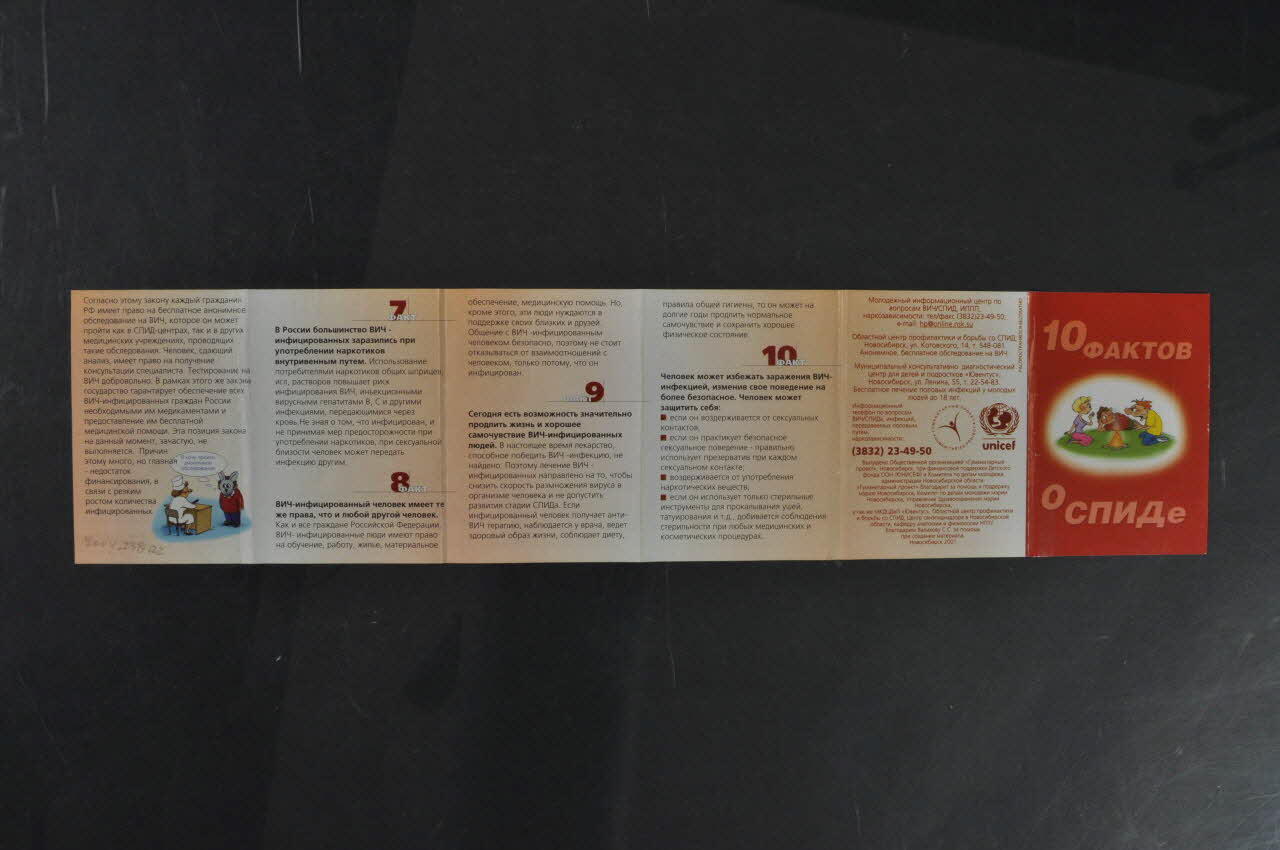 La couverture du dépliant, sur un fond brun, présente au centre, dans un ovale blanc, trois jeunes, deux garçons et une fille discutant autour d'un feu de camp. Le dessin est en couleur, dans un style BD. Au dessus et au dessous, en caractères cyrilliques brun clair, et en russe, figurent des inscriptions : "10 faits sur le sida"