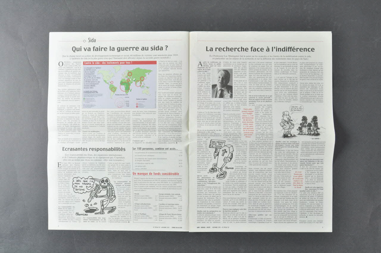 p.4 Sida. Qui va faire la guerre au sida ? Carte de l'épidémie de sida et des inégalités de développement économique et social. Manque de fonds. Disparités dans l'accès aux soins. (article signalé en première page)